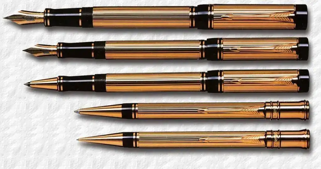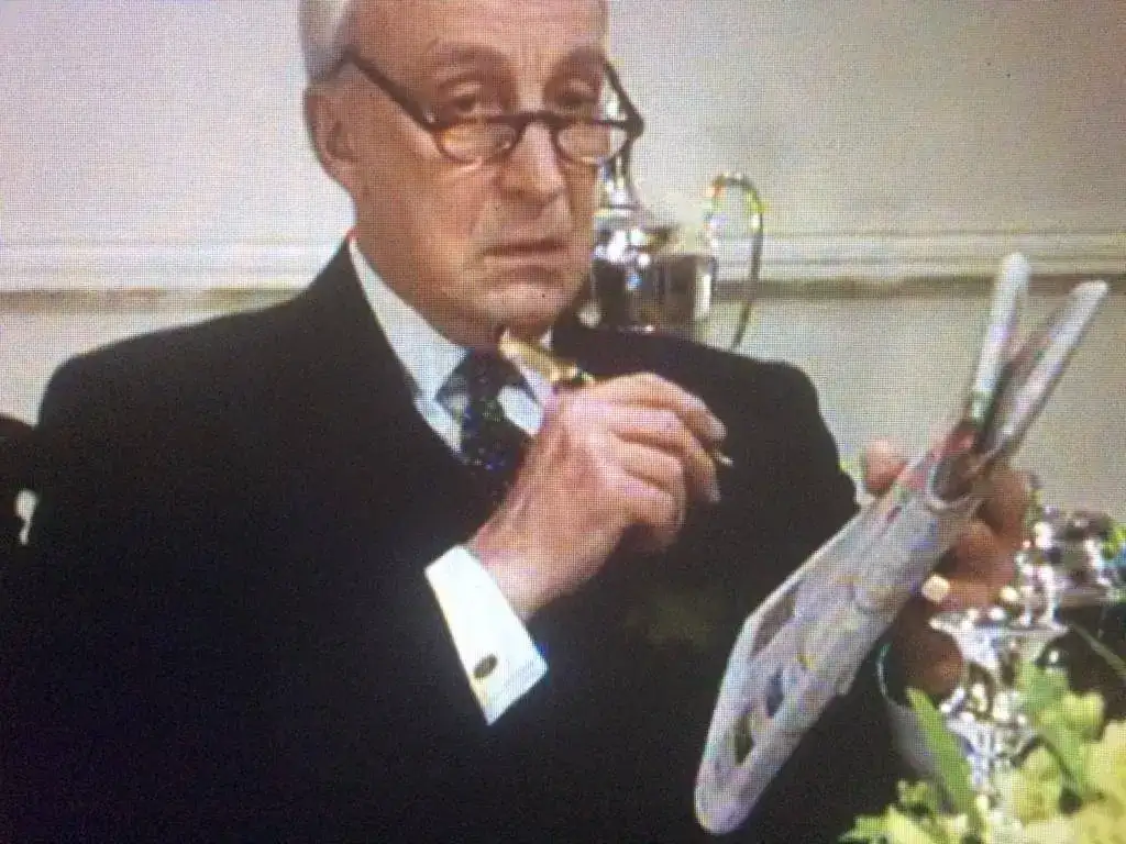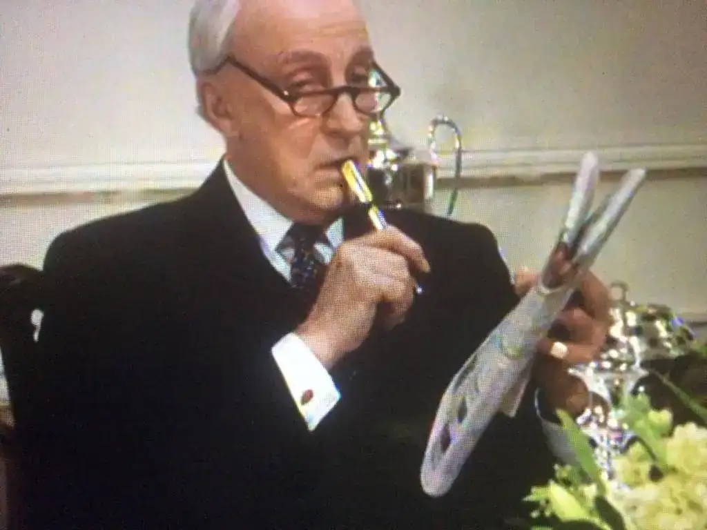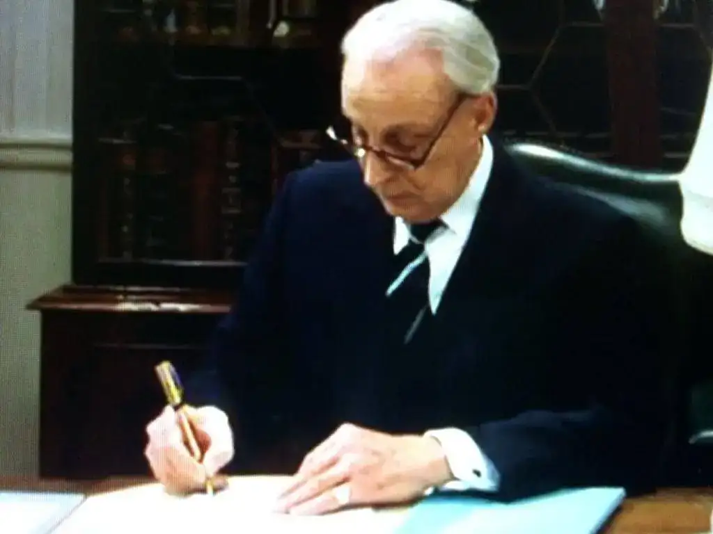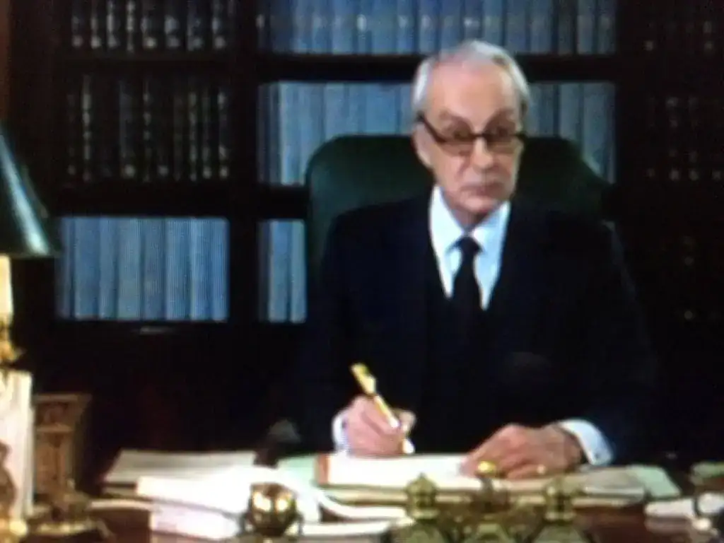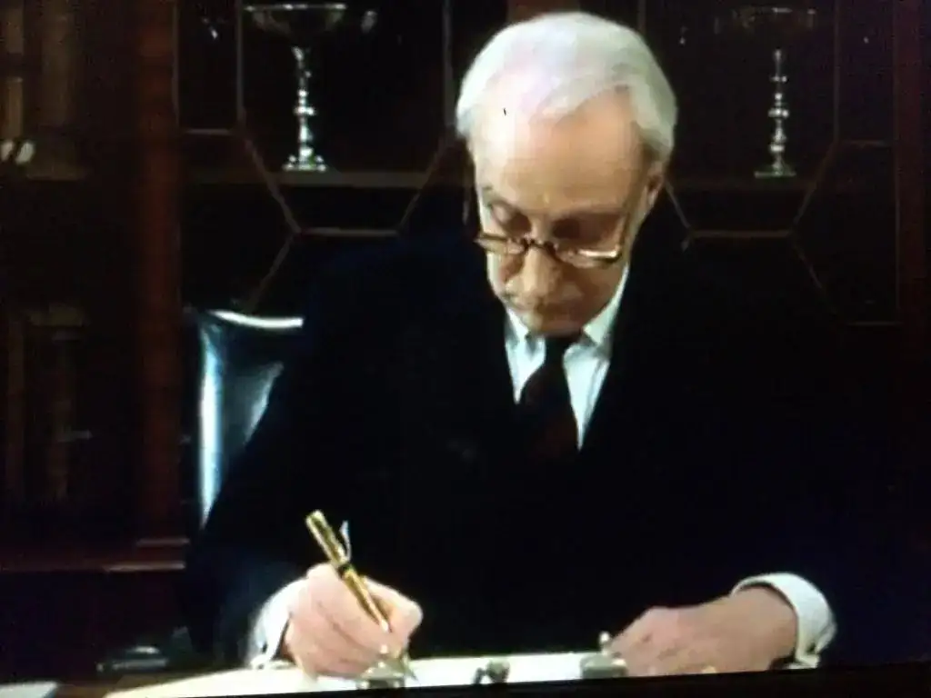 Viendo la mítica serie británica de la BBC, House of Cards, protagonizada por el gran Ian Richardson, me fijé en la estilográfica que utiliza en su papel de simpático Primer Ministro de Su Majestad. No me cabe duda que es una Parker Duofold chapada en oro con acabado "Godron", pero no acabo de inclinarme por si es el modelo "Centennial" o "International".