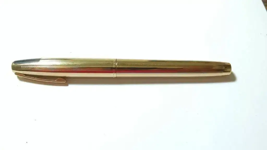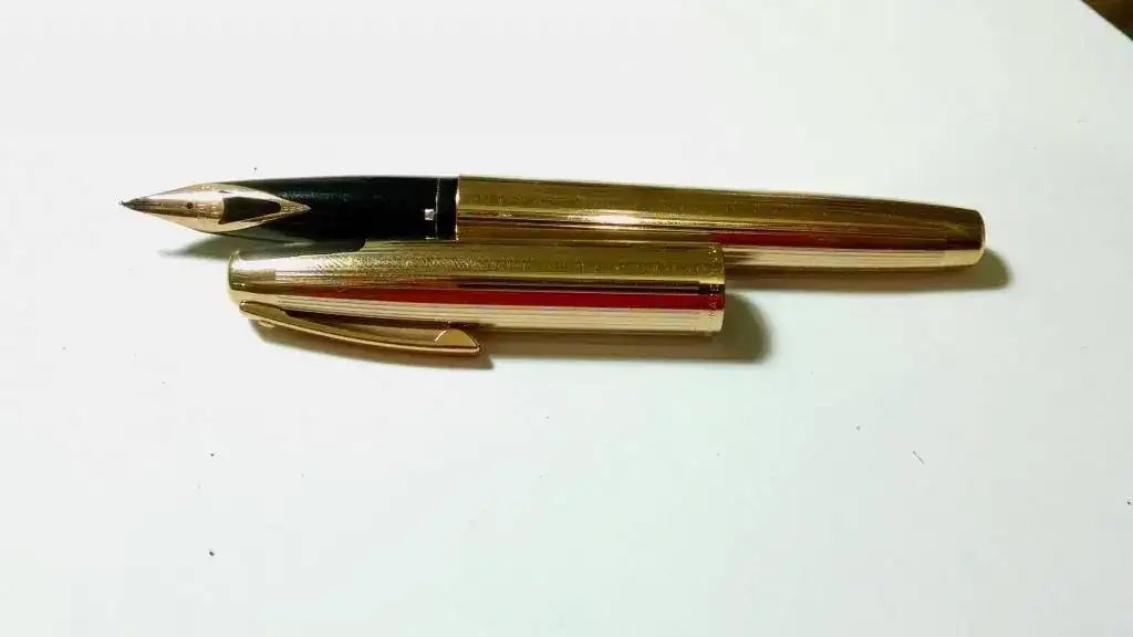 1. Es una Sheaffer Imperial 444 bañada en oro, con plumín de 14 kilates, trazo medio según pude investigar. Lo mejor es que el baño de oro de la estilográfica está totalmente libre de picaduras, rayones y corrosiones. Solamente por eso vale la pena el rescate que voy a emprender con ella.