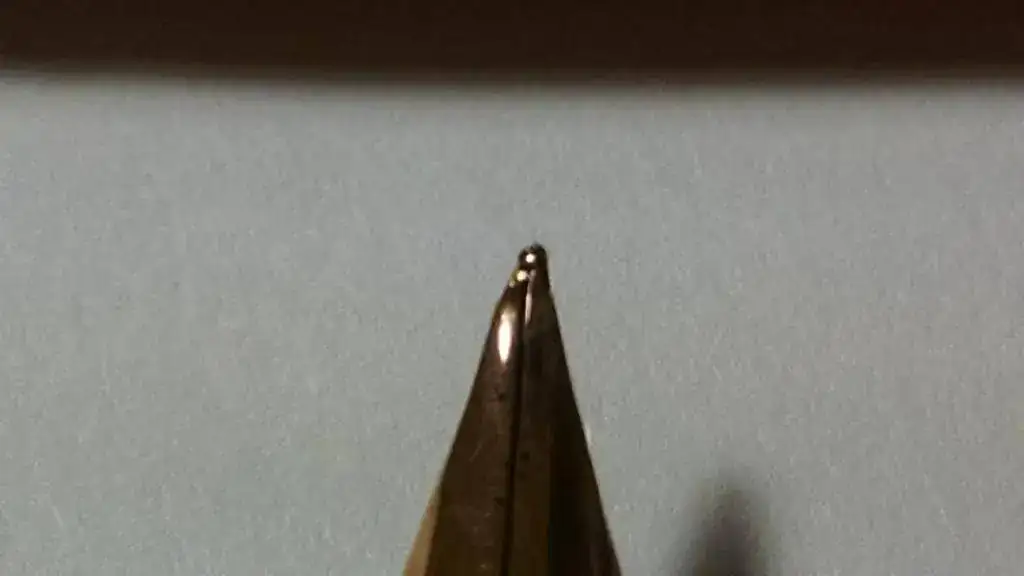 2. Me acordé ya muy tarde, que los plumines inlaid no son desmontables del todo. Este hecho va a dificultar la operación y voy a tener que trabajarla "a ver como" sin desmontar el plumín. Pero creo que aun así, va ser posible lograrlo dado que lo chueco del plumín se reduce al área inmediatamente posterior al iridio....O sea que se podría decir que es relativamente superficial el daño al plumín. ¿Alguna sugerencia?