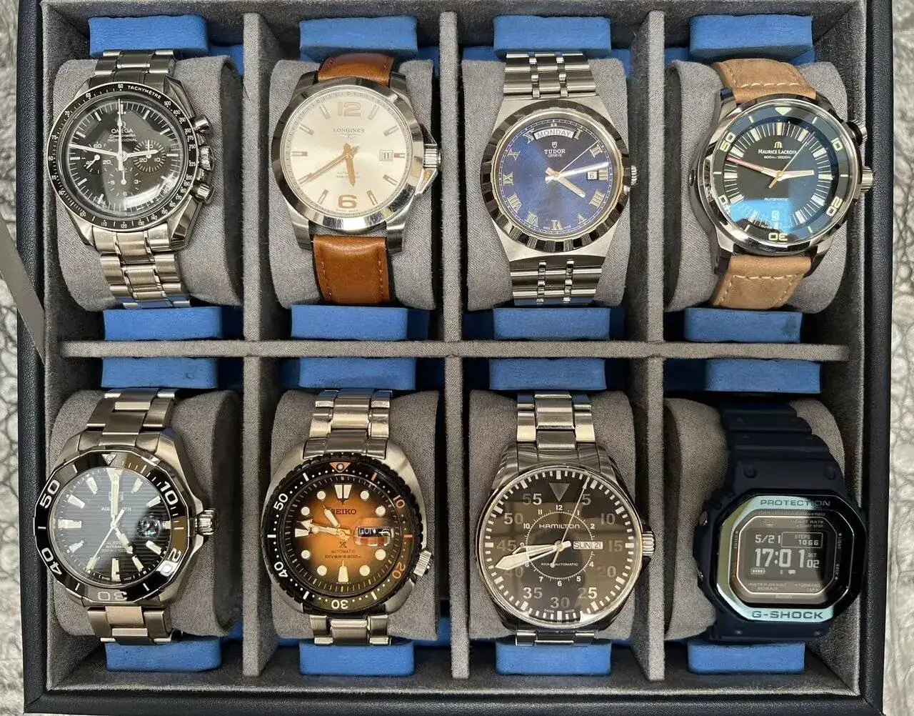 para mi el seiko prosprex de ahí es una gozada, sobre todo si quieres a meterte en el marLa bandeja de abajo son los típicos "que no cuentan". Muchas veces es difícil aguantar contenida la cantidad. Yo tengo una caja de 10, dos de ellos son los primeros, regalos de cuando era adolescente, porque con 8+1 (el de la muñeca) lo veo una buena cantidad. Pero siempre se juega con la trampa de... Bueno si entran más... Los saco de la caja y ya (porque no los uso pero está ahí porque me gusta verlos y que acompañen al resto).