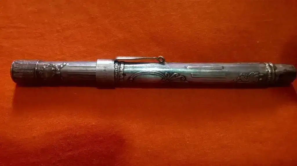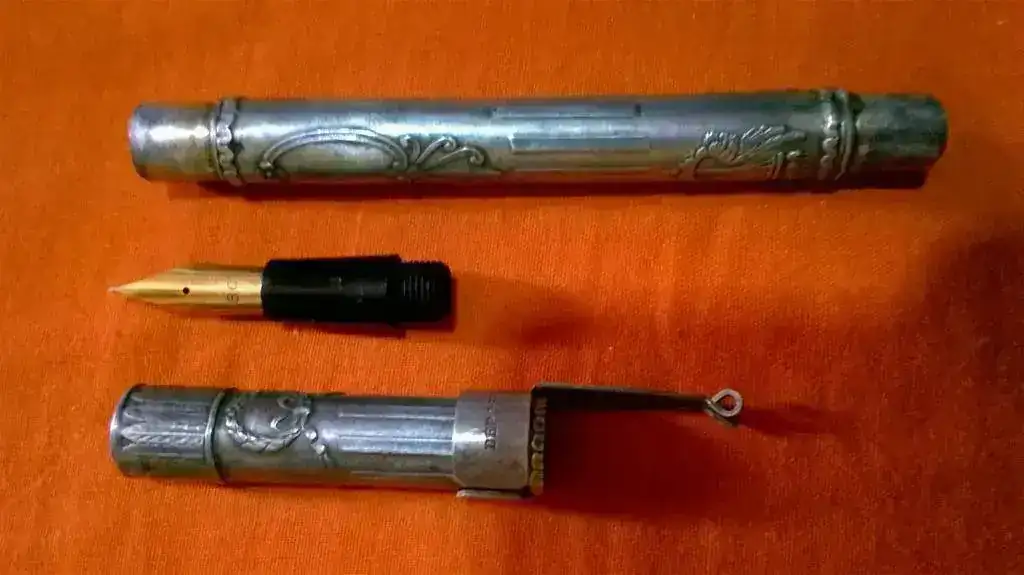 En la punta, tiene grabado 18 CT, lo cual me hace pensar que la punta es de oro de 18 kilates. Al parecer el cuerpo de la pluma es de plata, mas no tiene ningún marcaje al respecto. De lo que sí estoy seguro es que debe ser aproxidadamente del año 1900, ya que mi tía falleció en 1920.