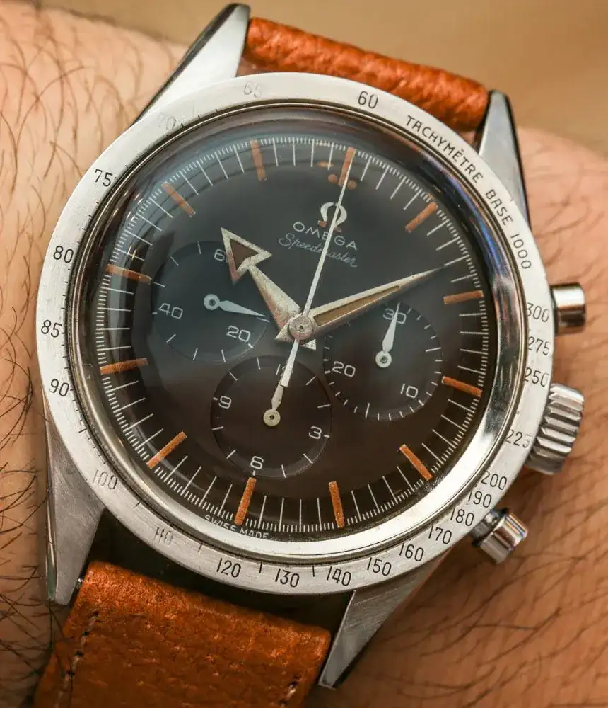 En la imagen vemos un Speedmaster del 1957, uno de los primeros. Como veis llevaban agujas tipo broad arrow y el bisel era en acabado metálico.
