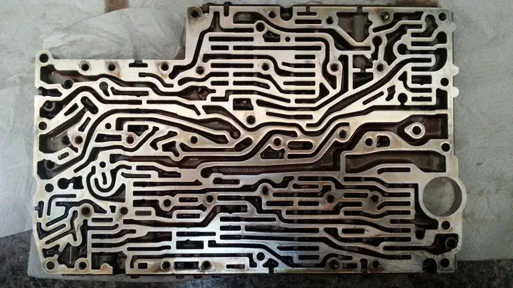 Caja inferior de correderas de un cambio automatico epicicloidal electrohidraúlico, antes de limpieza, revisión, ajuste y obviamente reparación y solución del problema (en un coche de 50.000€).