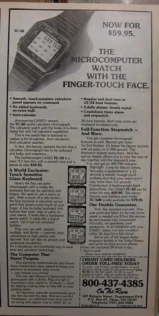 De todas formas los relojes calculadora Casio, una vez que conoces el HP-01 (el único reloj calculadora que sacó Hewlett-Packard), han de parecer malos. La razón es que en los Casio lo que es la calculadora es algo SEPARADO de lo que es el reloj, no hay ninguna conexión, por contra en el de HP, muchísimo más antiguo (es de 1977), con la calculadora podías operar con horas y fechas y usar los resultados en el reloj. O sea la calculadora y el reloj se integran totalmente. Puedes por ejm coger la fecha actual y saber qué fecha será dentro del número de días que indiques. Bueno, lo cierto es que Casio en calculadoras tampoco ha estado nunca muy inspirado, pese a que por ejm la primera gráfica de bolsillo fue suya (la tuve).