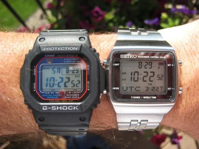 A favor de Casio he de decir que en sus radiocontrolados nunca he visto un error que ponga una hora incorrecta. Lo comento porque en algunos otros relojes (de mesa, pared o pulsera) de otras marcas sí que lo he visto, tanto es así que en algunos he desactivado esa función por el susto y molestia que pueden ocasionar (por ejm que llegues tarde a algún sitio al darte la hora mal). Incluso uno de los digitales que más me han gustado, el Seiko Spirit SBPG001 que puedes ver aquí junto a un Casio 5610, lo vendí porque el radiocontrol una vez (no sé si fueron una o dos) puso una incorrecta (lo tuve unos cuantos años, aunque no lo usé). Y era un reloj que tenía otras cosa chulísimas, pero ese fallo, y algún otro, me parecían imperdonanles. Ahora, lo vendí por un poco más de lo que me costó (estaba nuevo y ya era de coleccionista, al no fabricarse):