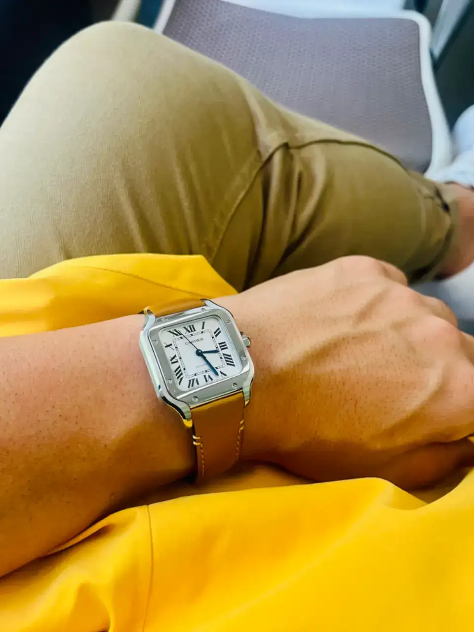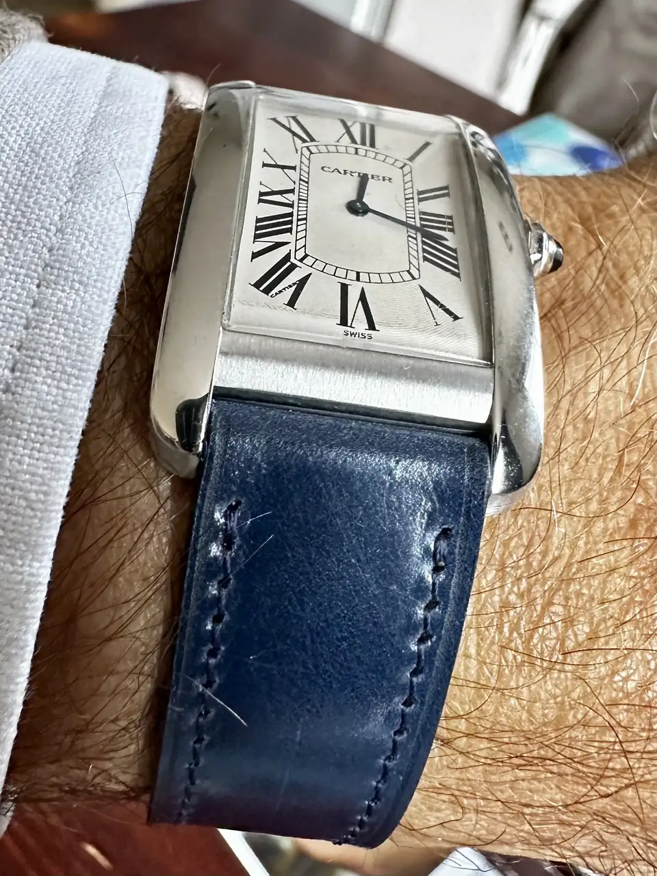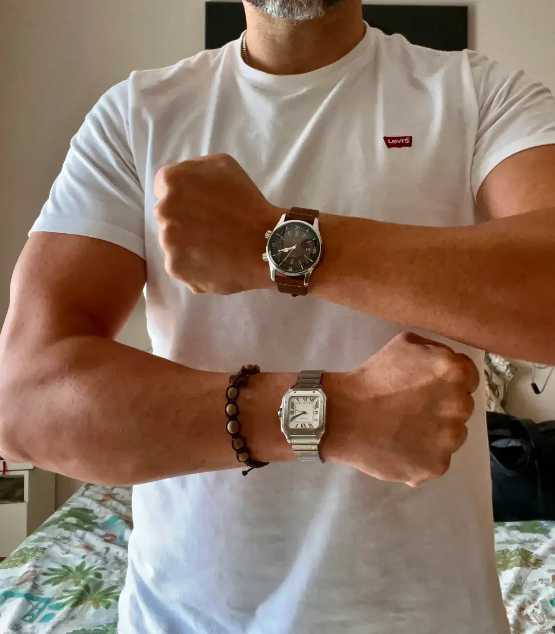 No puedo est más de acuerdo. A mi también me gustan los relojes grandes, de hecho muchos de los relojes son de 42mm. Pero también me gustan pequeños, depende de cada tipo de reloj. Los Cartier, concuerdo contigo, me gusta más como quedan en un tamaño más contenido. Cuando me compré el médium pude elegir entre ese y el XL y para mi era mucho más bonito el menor de los dos. Aquí tienes una foto de espejo, que es como mejor se ve la proporcion, de un reloj grande (Longines LD) al lado del “pequeño” Cartier, uno en cada muñeca. Creo que ambos quedan bien pese a la diferencia de tamaño ya que ambos son coherentes con el tipo de reloj que son.