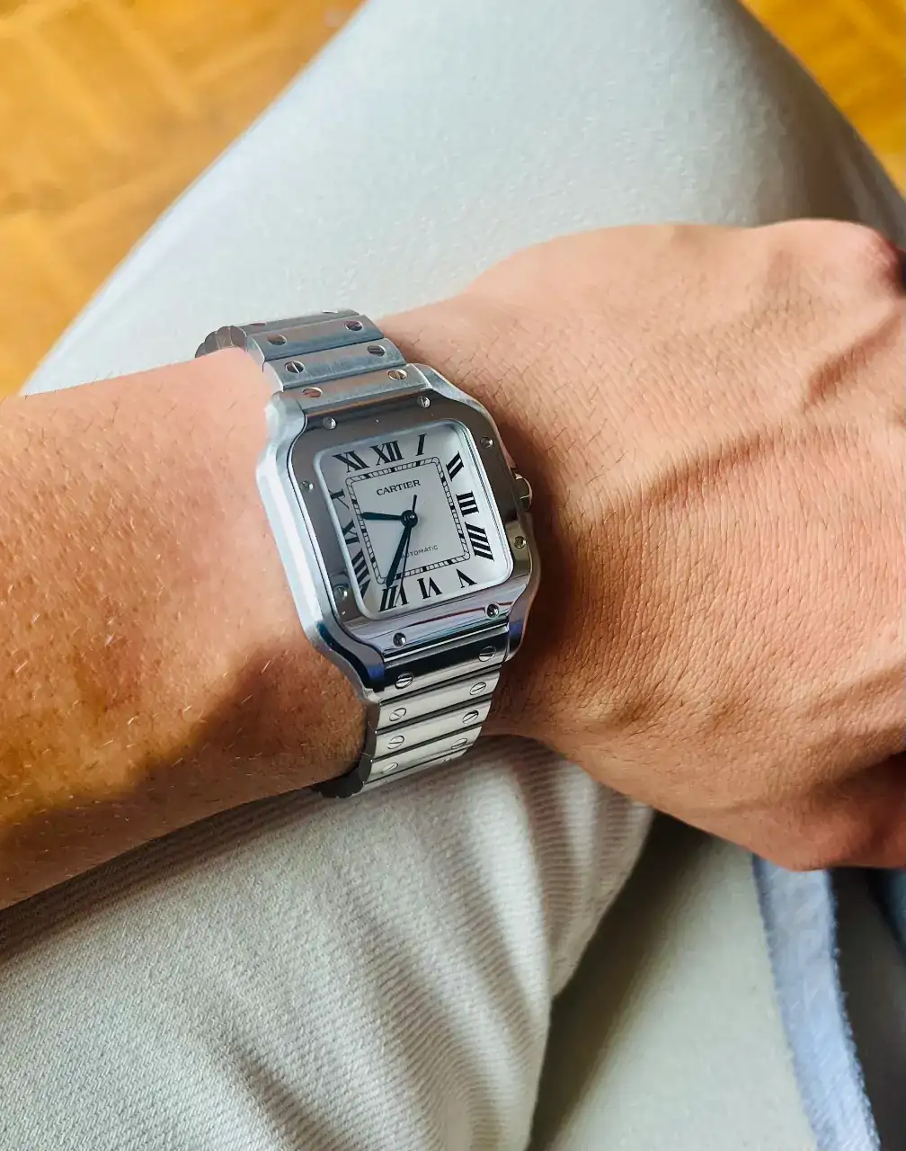 A mí me gustan los relojes grandes tambien, pero a mi parecer las versiones XL del Santos desvirtúan el origen y la esencia del Santos y rompen también con la propia esencia de Cartier. Creo que las versiones más pequeñas mantienen más esa esencia y eleganciaCorrecto, tamaño mediano. Es un reloj que calza bastante grande para sus medidas. Mi muñeca es de 18cm para que te sirva de referencia.