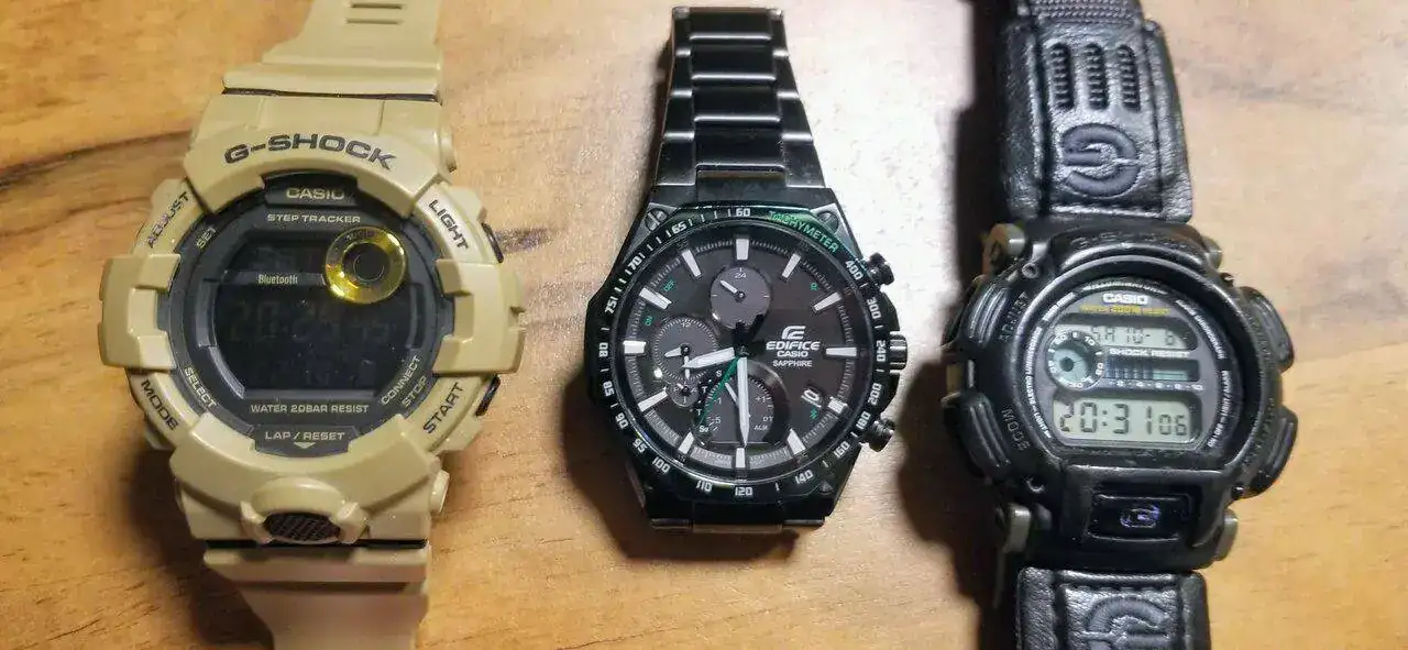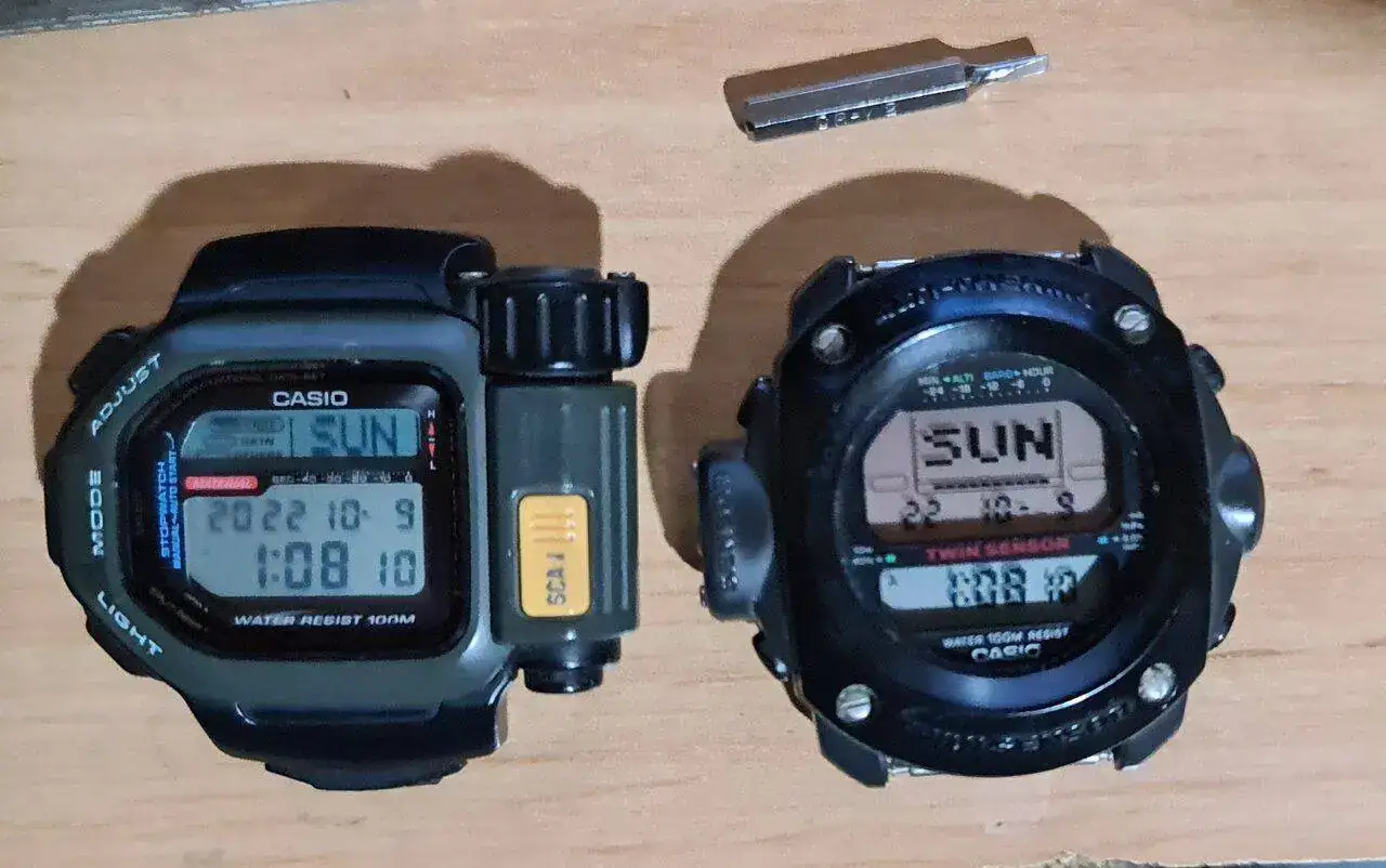 La verdad es que los G shock me gustan mucho. Aqui la foto de familia de mis Casios. El de la derecha es el reloj de mi adolescencia, que despues de encontrarlo mi hermano en un cajón estando años perdido fué cambiarle la pila y funcionar perfectamente. Y el de la izquierda, un modelo mas o menos básico, bajó este verano a 35 metros de profundidad en el mar como un campeón (quizás lo use a partir de ahora como reloj de soporte en las inmersiones, a ver cuanto aguanta).