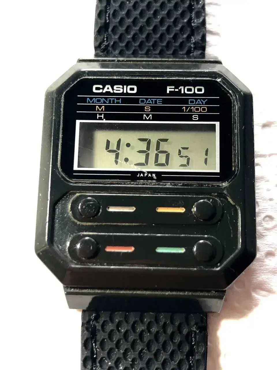 Me encanta verlo, porque me encantan los modelos antiguos de Casio, me encanta cuando veo esos números de módulo tan bajitos, el 52 es la antigüedad de Casio, pero también para constatar lo bien hecha que está la reedición, tengo el A-100 y me gusta mucho. Has hecho que lo saque de la caja para ponerlo en la mesilla y usarlo los próximos días. Pero ese JAPAN del original da gusto verlo.