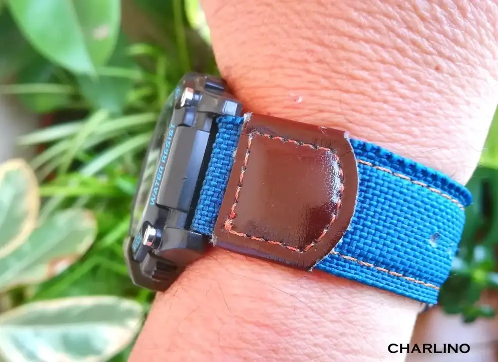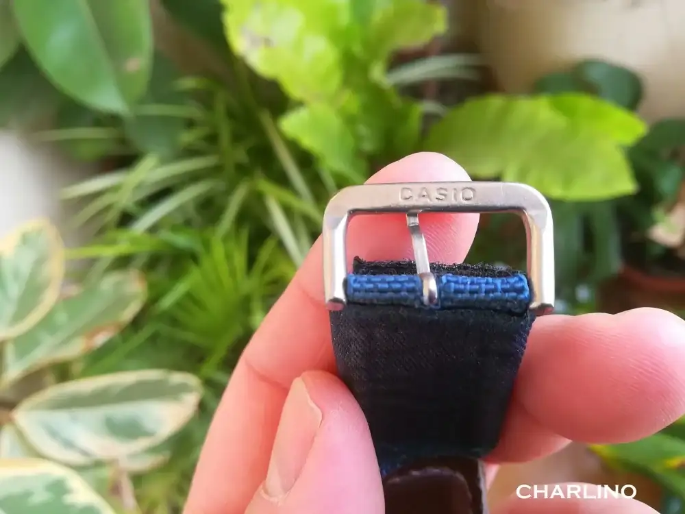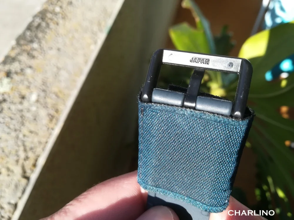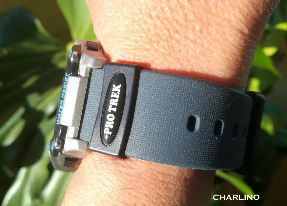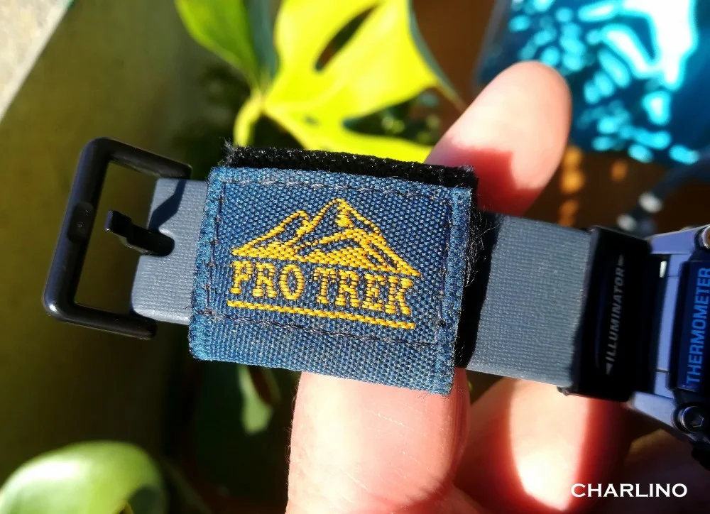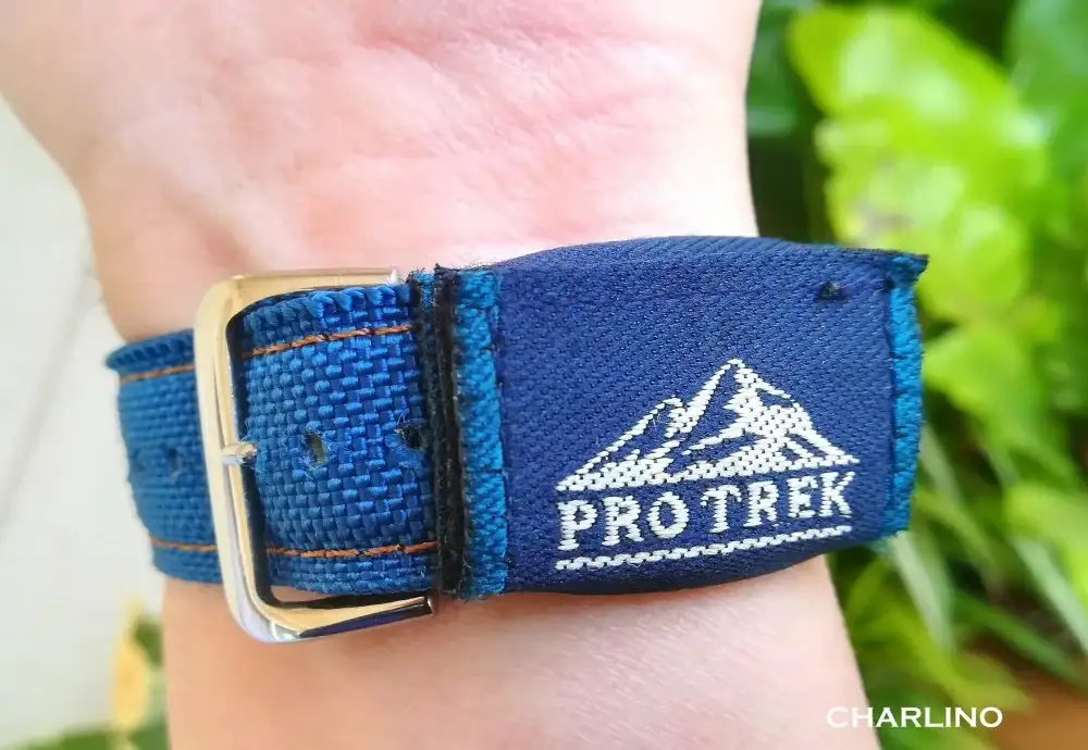 Este también lleva una de las correas originales de estos Pro-Trek antiguos. Esta es de caucho azul imitando una textura de tela, y es increíble lo bien que lleva el paso del tiempo, con casi 30 años sigue en buen estado y al usarlo no parece que se vaya a partir, está flexible y bien, aunque trato de no sudarla. A modo de trabilla lleva el mismo sistema que la del PRT-10 negro de ayer, una pieza de tela grande con el logo Pro-Trek de las montañas cosido. Se ve muy artesanal y sencillo, con un encanto vintage.