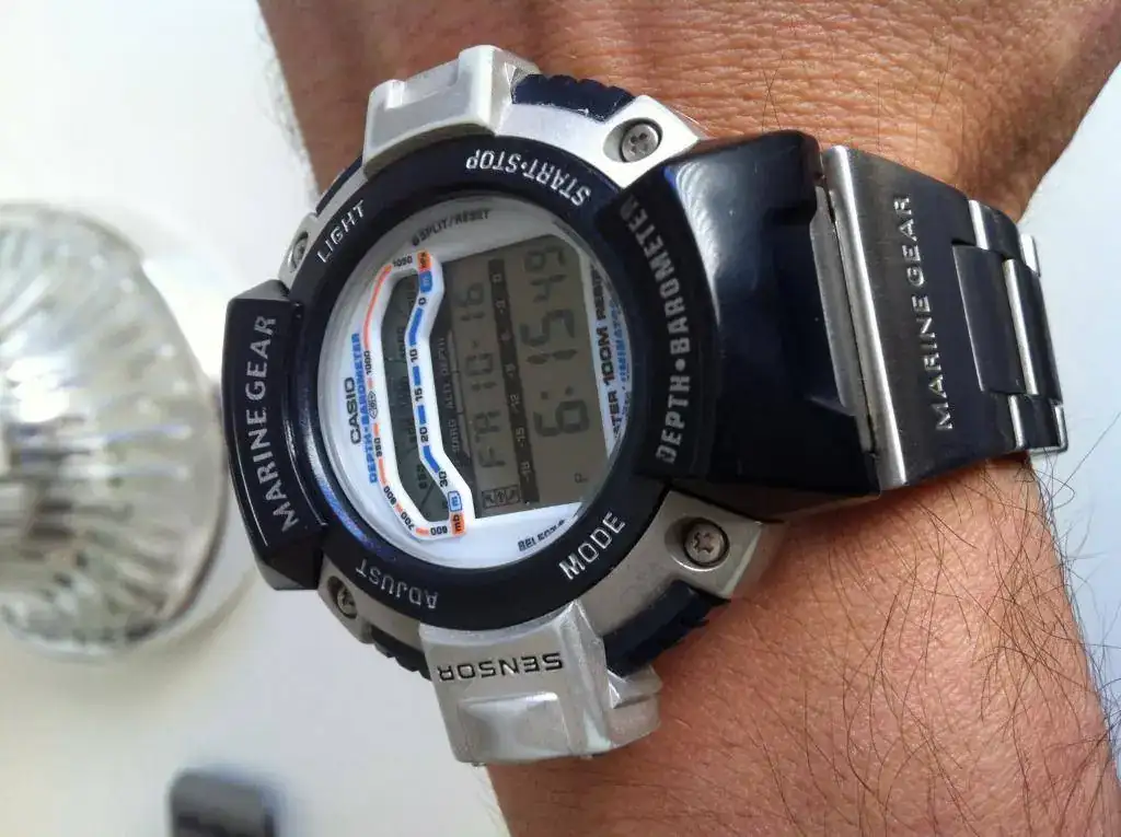 El mio, ya tiene sus añitos pero va como el primer día, un Marine Gear, altímetro hasta 4000msnm, presión atmosférica y lo mejor, profundímetro hasta -30m. Para apnea es genial!. Lo presento con su armis y tambien tengo la de caucho para el verano y la playa.Ver el archivos adjunto 302720
