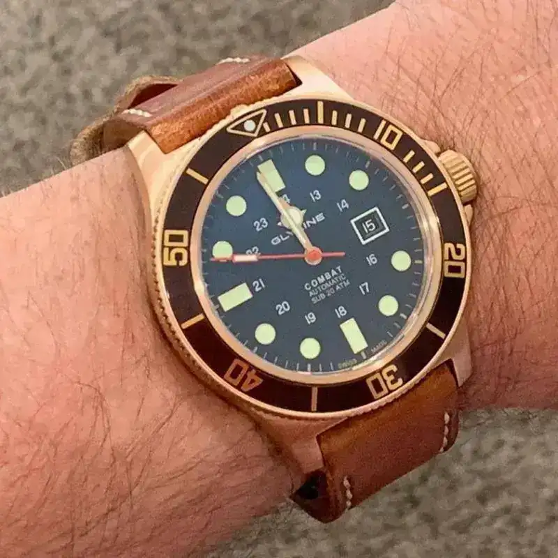 Estoy enmelonao con un reloj, en concreto el glycine combat en dos versiones. El archiconocido golden eye y su homologo en version bronce