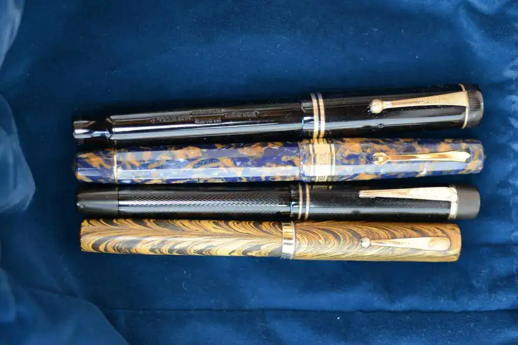 Desde arriba: Parker Duofold, Omas Extra en un precioso celuloide, Onoto de la Rue 6233 y Waterman´s 94 Olive Ripple