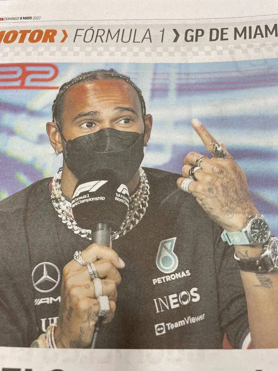 Viendo estas fotos de la rueda de prensa de Hamilton si no me equivoco lleva cada uno de los tres relojes con una hora diversa. Creo que es un claro ejemplo del nuevo uso de los relojes como outfit y no para su principal utilidad que es dar la hora, ni que decir tiene que me parece una horterada brutal.