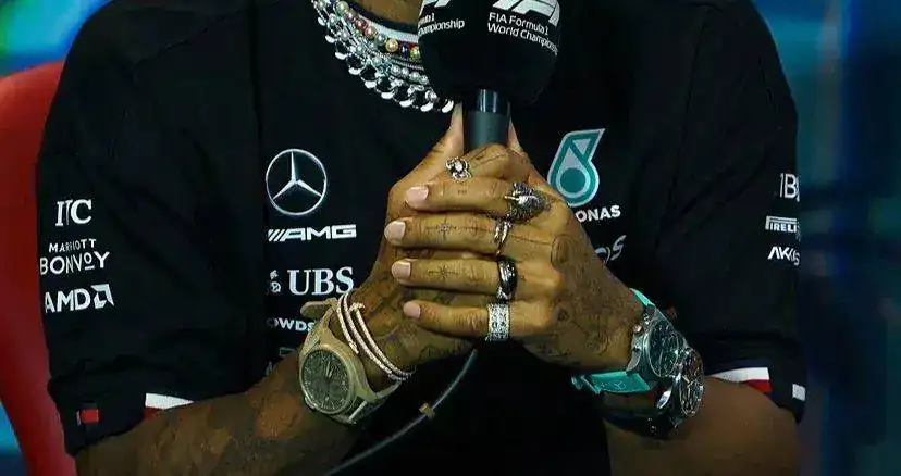 Viendo estas fotos de la rueda de prensa de Hamilton si no me equivoco lleva cada uno de los tres relojes con una hora diversa. Creo que es un claro ejemplo del nuevo uso de los relojes como outfit y no para su principal utilidad que es dar la hora, ni que decir tiene que me parece una horterada brutal.