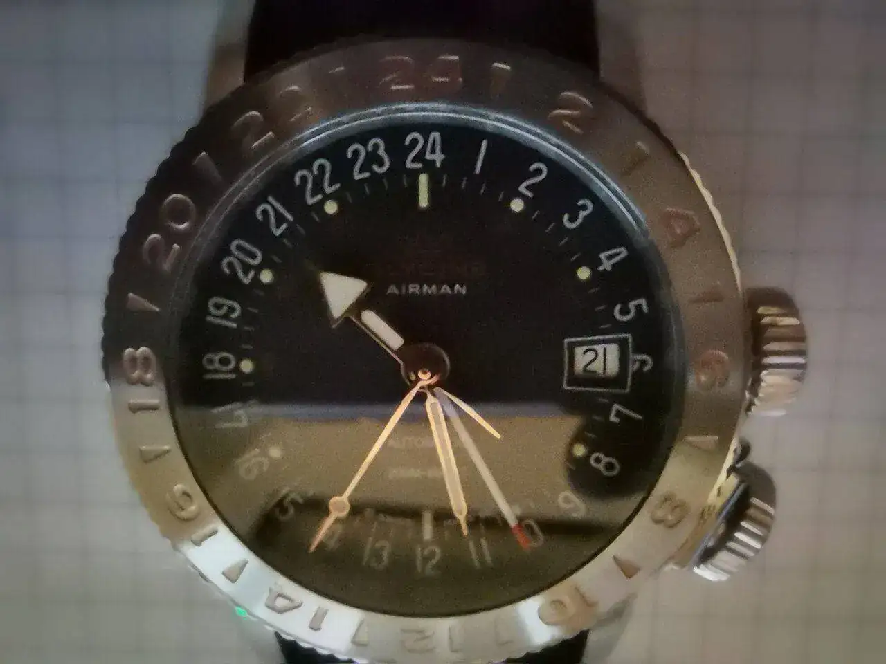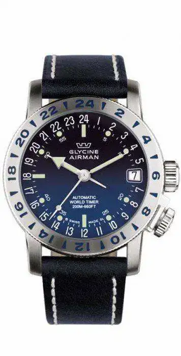 En el ejemplo que adjuntas, se trata de un Airman "Purist". El reloj funciona como un 24h (es decir, la aguja horaria da una sola vuelta al día) y tiene un bisel GMT, por lo tanto, este reloj puede indicar dos husos horarios.
