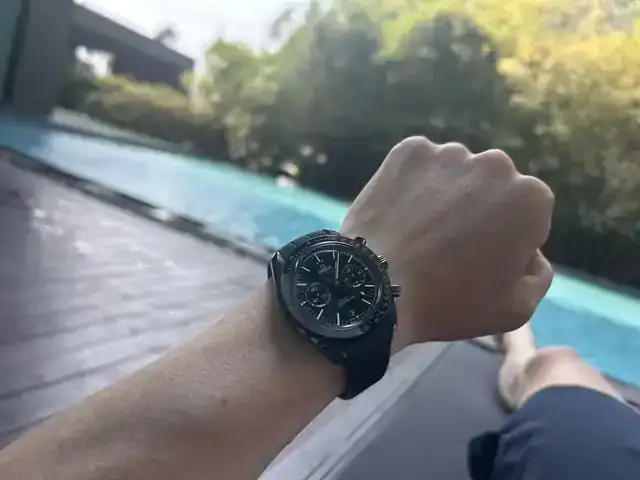 Es el Omega Dark Side of the Moon más antiguo, con la correa de caucho del modelo nuevoSportdriving, por favor, acércalo un poco para que lo veamos mejor, no nos dejes así. ¿Qué modelo concreto de los Speedmaster Dark es?