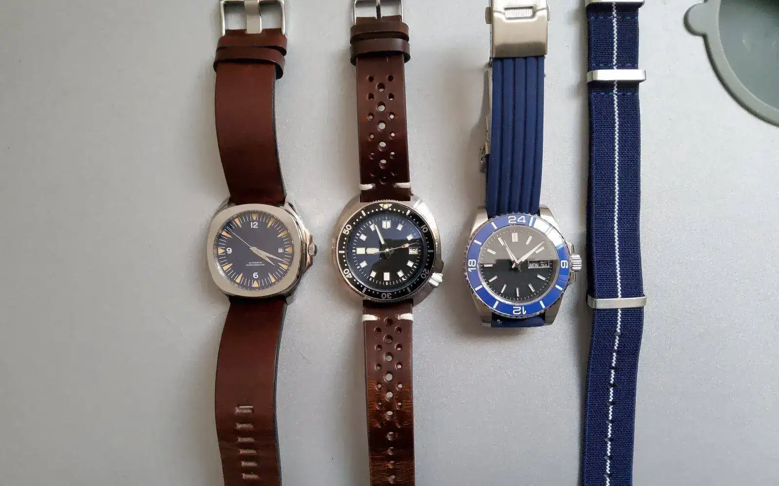 El de la izquierda es un Miyota 8215 y el resto NH36 y 35