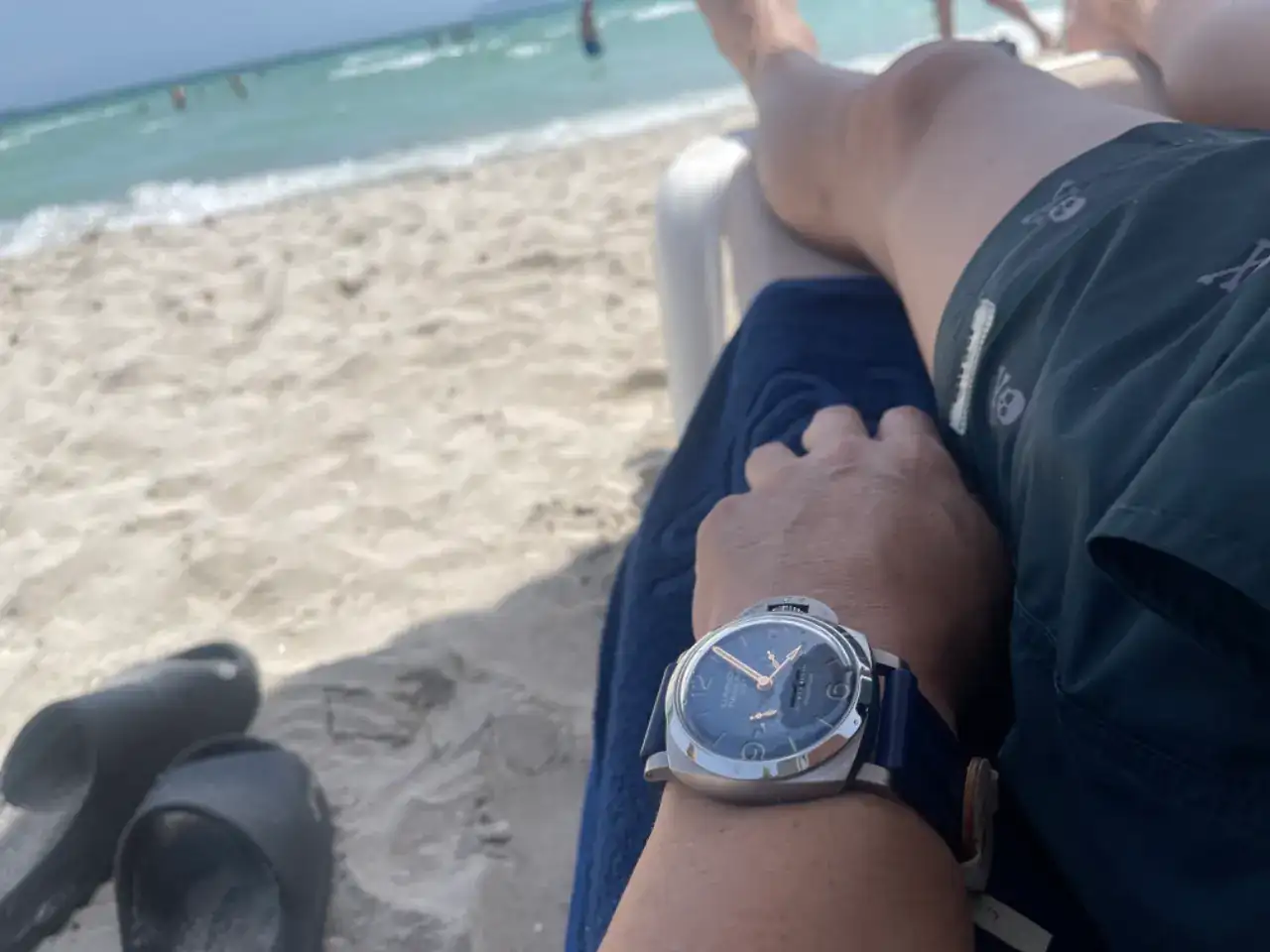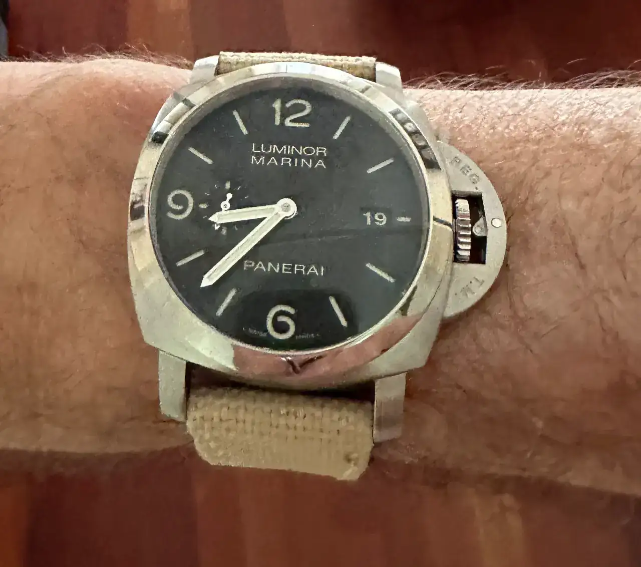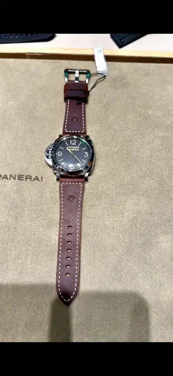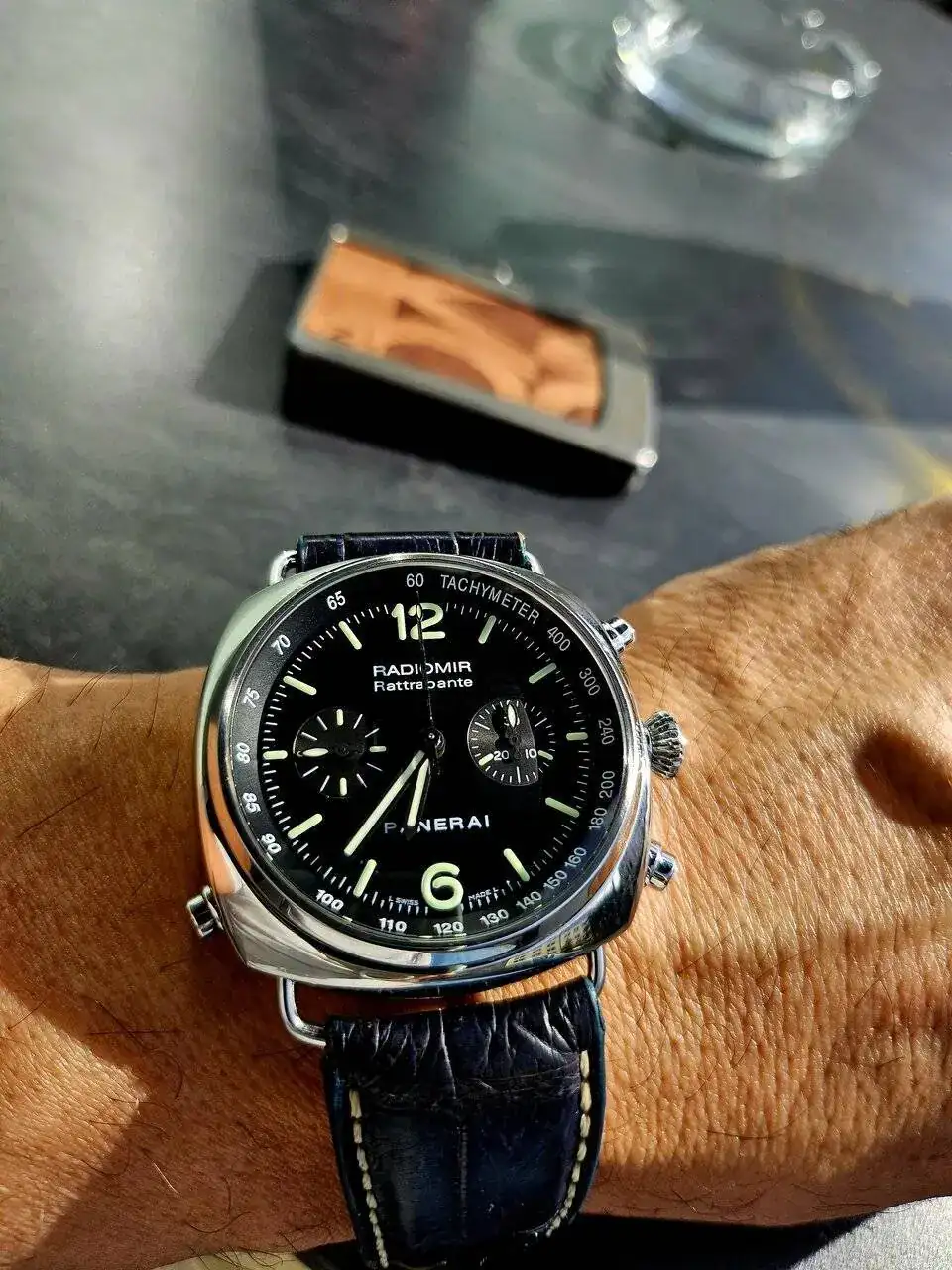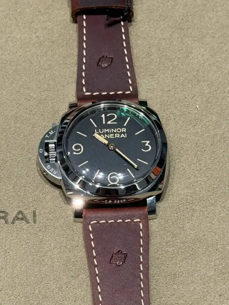 no se ve muy bien la foto (perdón), pero se aprecia un poco mejor el conjunto. El toque sepia de los pespuntes armoniza con el dorado de las manecillas perfectamente.