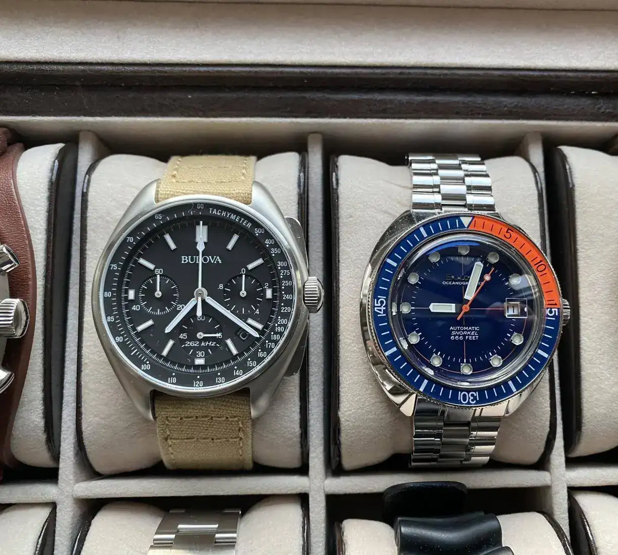 Me ha sorprendido, indagando en la historia de la marca fundada en USA en 1875 por el checo Joseph Bulova, que inventó el primer reloj radiocontrolado en 1928 y que en 1950 fabricó el primer reloj electrónico del mundo llamado Bulova Accutron. La particularidad del Accutron fue que supuso una especie de transición entre los relojes mecánicos y los cuarzo posteriores, siendo el movimiento del segundero seguido. Se vendieron 4 millones de relojes hasta que cesó su producción en 1977. Desconocía que participó en varias misiones de la NASA desde 1958, compartiendo viaje con el Omega Speedmaster en el Apolo 11 que aterrizó en la luna en 1969. Los astronautas llevaban el Omega y el Bulova estaba en el propio modulo lunar LEM.