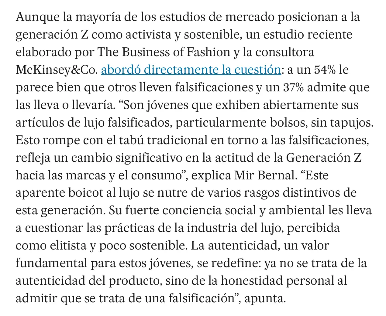 Son formas de verlo. Para mí es una lectura interesante para ampliar la visión sobre el tema y que cada uno saque sus propias conclusiones. Las mías no coinciden con las tuyas, evidentemente.Puro intento de lavado de cerebro a los jóvenes de los medios afines a la Agenda 2030. Todo está genial: Comer bichos, no lavarse o andar en patinete a -20 grados. Ahora, llevar cosas falsas. Mañana vete a saber qué será...
