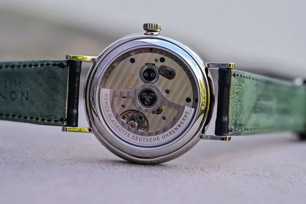 El calibre DUW 6101 de Nomos Ludwig neomatik 41 está propulsado por un mecanismo de fecha patentado e integrado colocado alrededor del movimiento en el perímetro. A su vez, esta solución significa que la fecha se coloca en el borde de la esfera, una rareza en relojes de más de 40 mm. Equipado con un disco de programa en forma de corazón que permite que el trinquete avance la ventana de la fecha cada cuatro vueltas, el movimiento de 35,2 mm conserva una altura delgada de 3,6 mm. Incorporando facilidad de uso, la fecha se puede ajustar en ambas direcciones con unas pocas vueltas de la corona. La precisión del movimiento de fecha neomatik se ve reforzada por la incorporación del escape patentado con una espiral azul templada conocida como Nomos Swing System. Los acabados que rinden homenaje a la tradición relojera de Glashütte incluyen la platina de tres cuartos con nervaduras de Glashütte (también utilizadas en el rotor calado) junto con los tornillos azules templados y el perlaje Nomos en la platina principal. La reserva de marcha es de 42 horas.