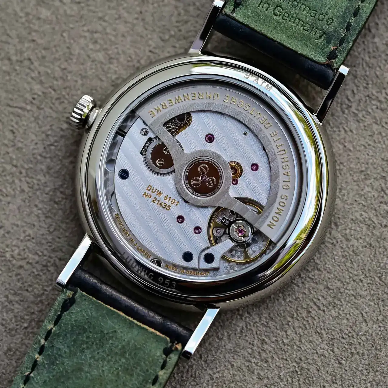 Movimiento: calibre DUW 6101, neomatik de manufactura con sistema de fecha y oscilación - 3,6 mm de altura - 27 rubíes - 42h de reserva de marcha - horas, minutos, segundos y fecha - parada - segundero y ajuste de fecha bidireccional