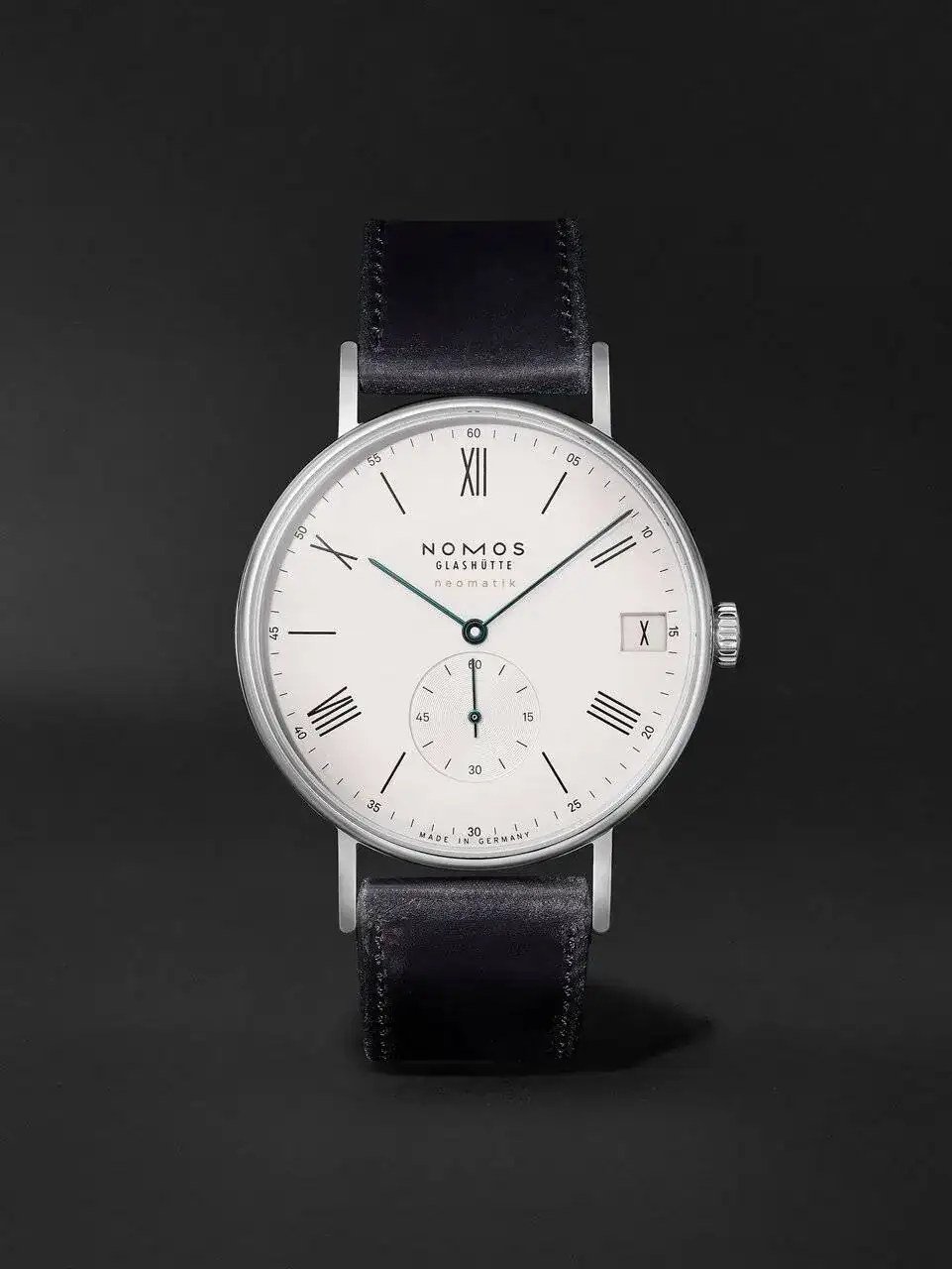 El Nomos Ludwig neomatik 41 date viene con una correa de cuero cordobán de concha genuina Horween negra con un cierre de acero inoxidable con alas. Este cuero grueso, liso, robusto y de alta calidad está fabricado por la empresa estadounidense Horween y se extrae de los cuartos traseros de un caballo. El reloj se vende por