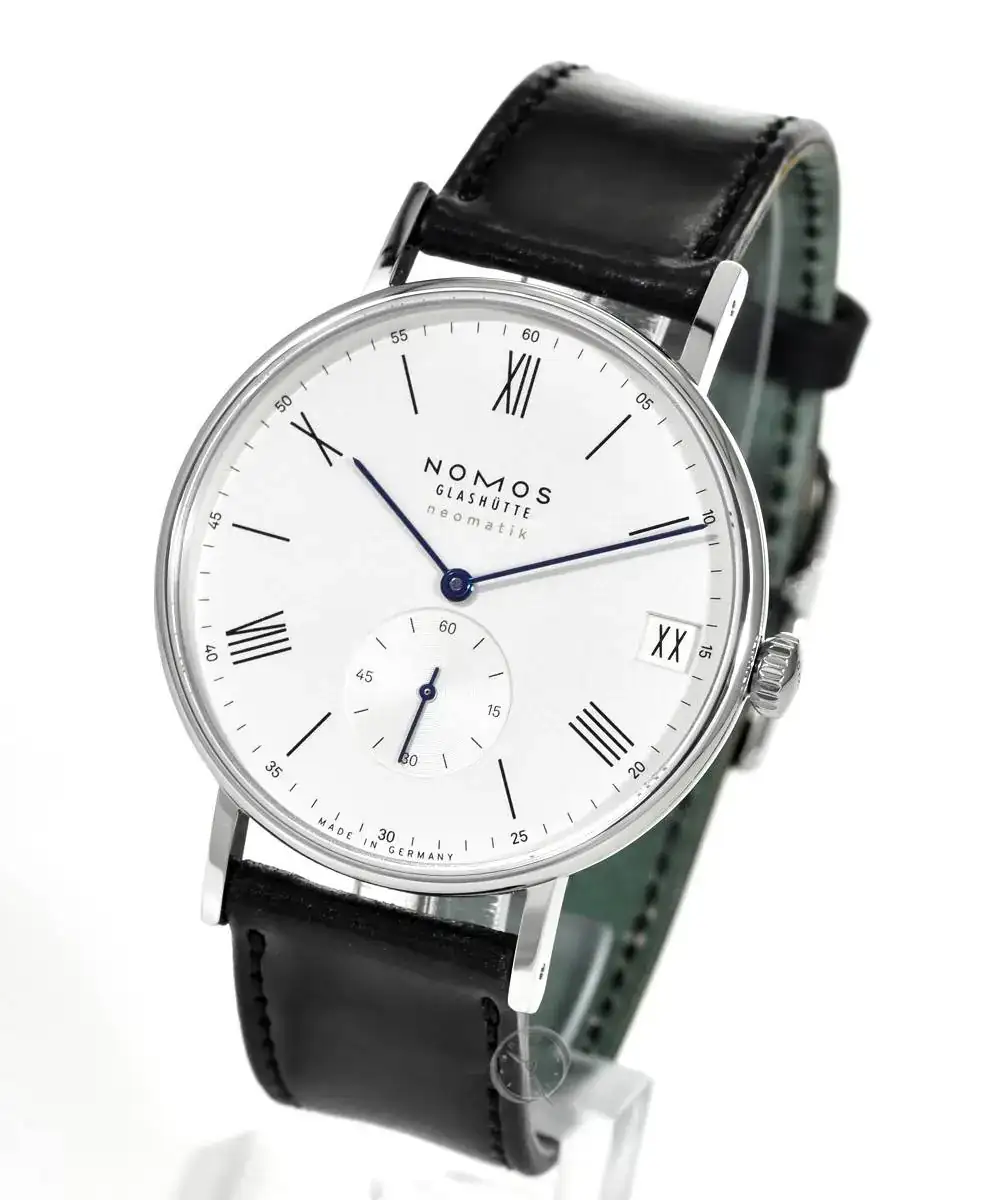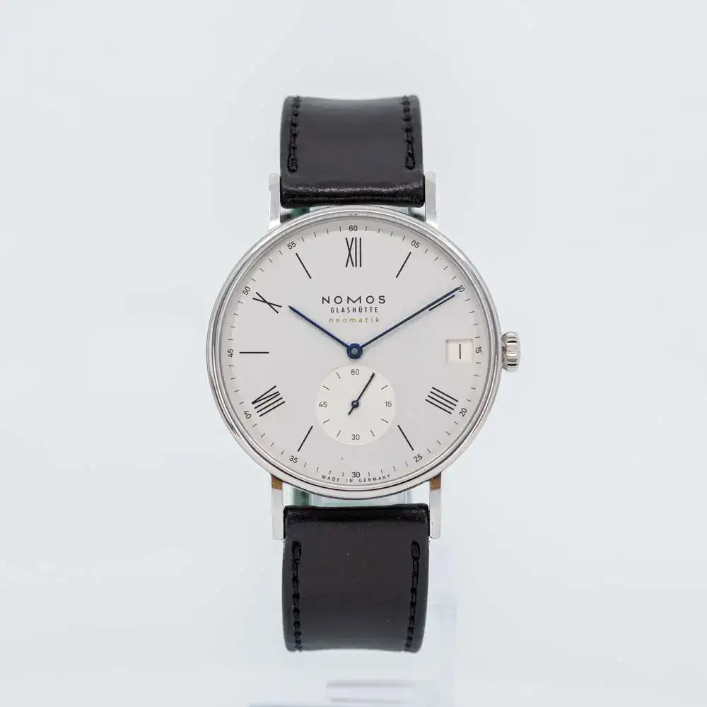 Como todo el mundo sabe, hacer algo sencillo suele ser muy difícil. El equilibrio y la proporción de los elementos de la esfera desmienten la mano experta del equipo de diseño de Berlinerblau. Los números romanos negros pueden ser clásicos, pero sus líneas finas y alargadas reflejan un lenguaje de diseño más contemporáneo. Los números romanos van acompañados de una minutería negra con intervalos de 5 minutos representados por números arábigos y un pequeño segundero ligeramente empotrado a las 6 horas, también con números arábigos. Las esbeltas agujas azules templadas indican las funciones del tiempo, y la tipografía de las inscripciones es otro toque distintivo de Nomos junto con detalles de diseño, como 'neomatik' elegido con letras doradas ligeramente en relieve.