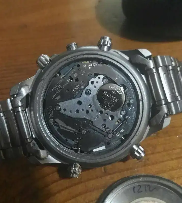 Por cierto, si miras de cerca a través de los agujeros del puente de rodaje se ven varias de las ruedecitas...todas de buen metal, nada de plásticos...Este era un calibre bien hecho, el que sacó Citizen en la segunda mitad de los años 80 para responder al primer crono de cuarzo analógico de la historia, que fue el Seiko 7A28/38 de 15 rubís, de 1983. Eran calibres fabricados para durar mucho, hechos en metal y con las principales piezas móviles asentadas sobre rubíes. Calibres totalmente reparables, como los mecánicos, y en el caso de este 3S10 Miyota de Citizen, muy adelantado tecnológicamente. La mezcla de calidad mecánica y de materiales con la alta tecnología electrónica que tiene este Miyota 3S10 es muy atractiva, y difícil de ver hoy día.