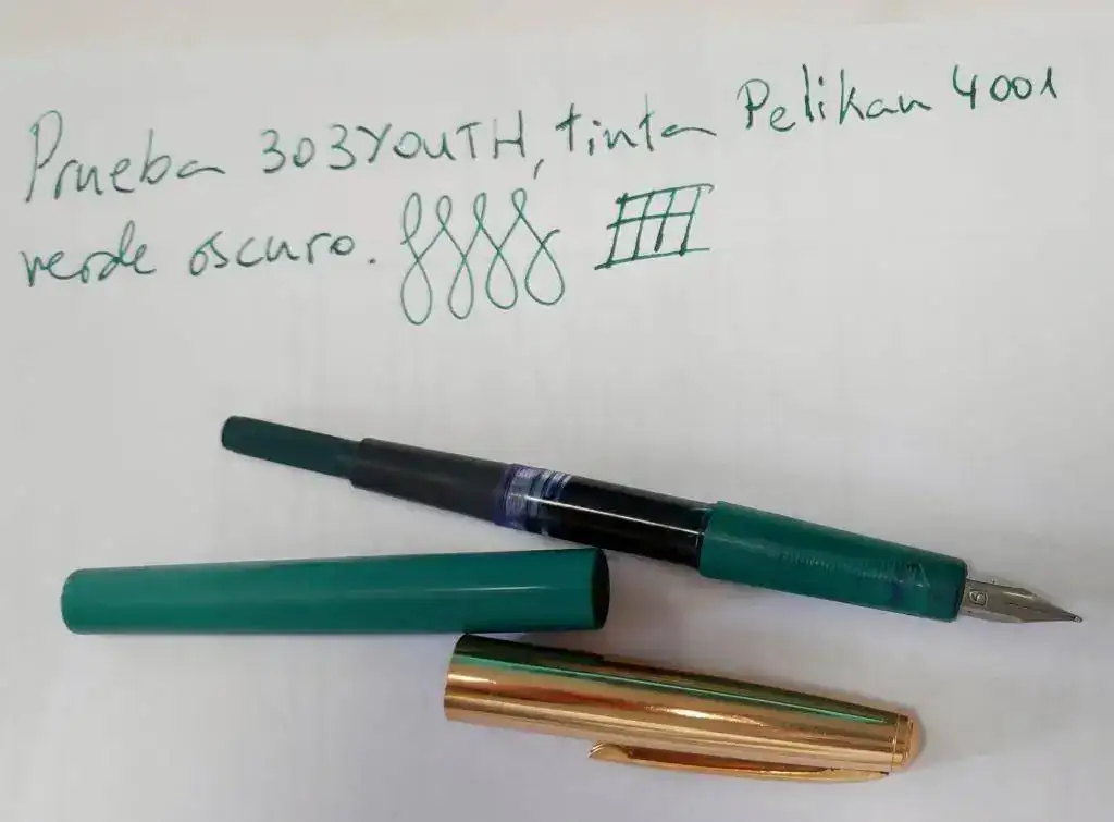 Tened en cuenta que puede que le falte algún adorno o pieza, he visto que en el capuchón pone 303YOUTH pero solo he encontrado que podría ser una réplica china de una Parker 51, o una marca china generalista, pero no coincide con nada que vea por internet.