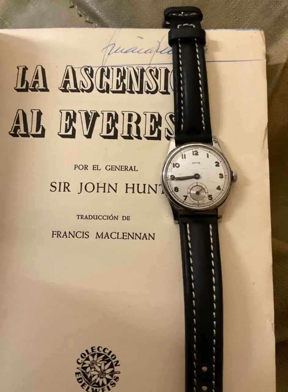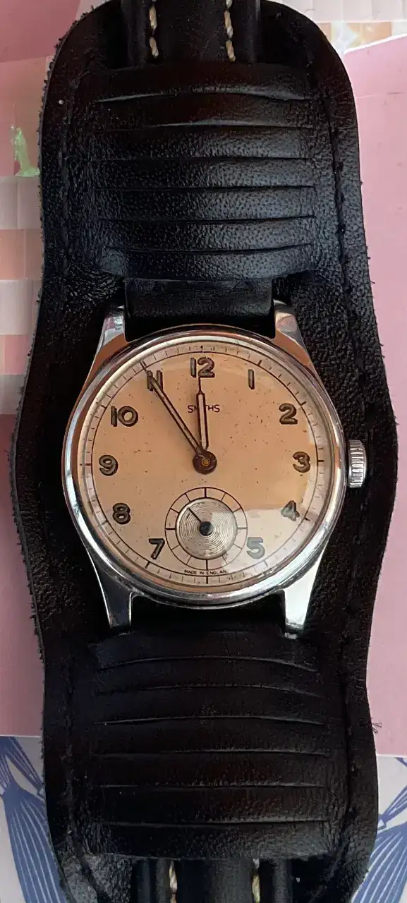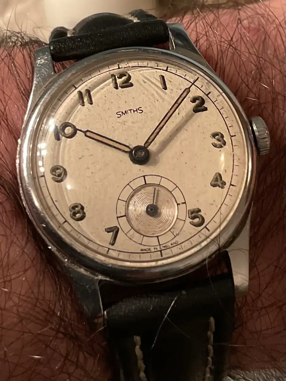 Ostras! Enhorabuena!!!Bueno, mi primer reloj británico Made in England de pura cepa (aunque a los Smiths de ahora se les permite), un Smiths pre-DeLuxe de entre el 47-49, muy similar a los prototipos de reloj “Everest” como el de Hillary, con numerales con cierta ‘tridimensionalidad” y agujas jeringa y caja Dennison de acero.