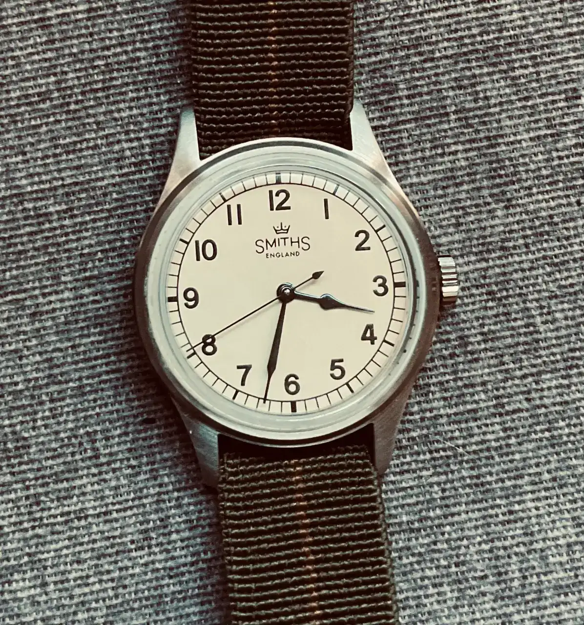 Recreación de Smiths de la RAF. Los fabricaron Omega, Longines, JLC, Ebel, Waltham, pero lo que no se suele saber es que Smiths también los fabricó… pero al parecer se quedó en fase de prototipo (hay muy pocos ejemplares) y no se distribuyó, por lo que la nueva Smiths puede reclamar cierto derecho a recrearlos.