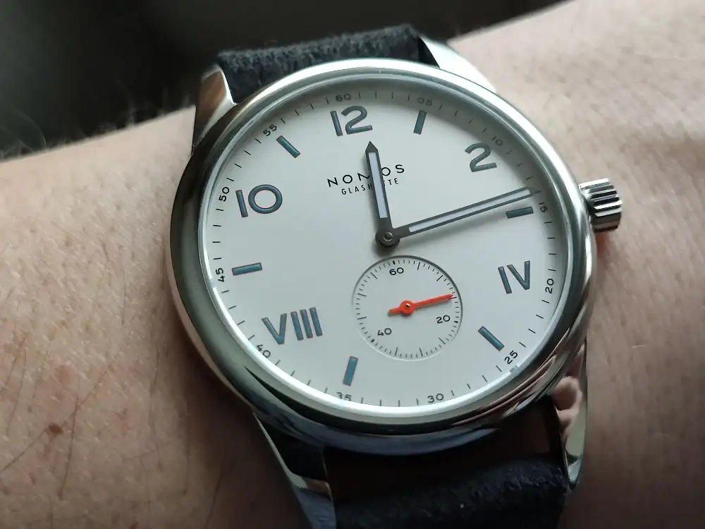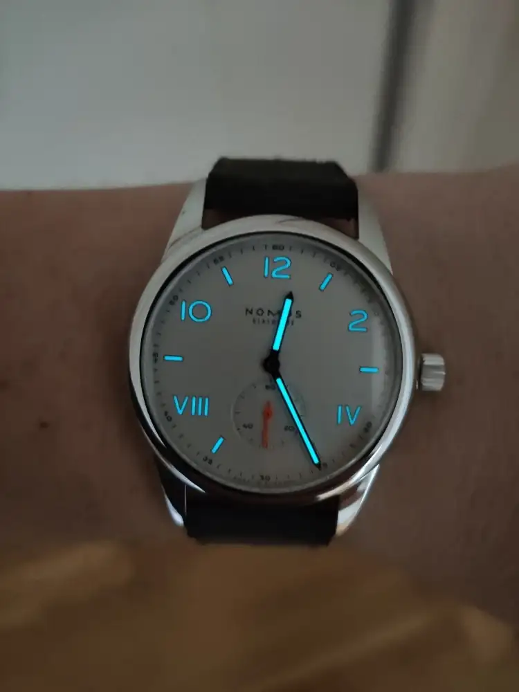 En el Nomos no me veo reflejado, y en el Hamilton sí... al igual que en el Hamilton a veces tengo problemas con ciertos ángulos par ver la hora y en el Nomos no. Las razones no las sé claramente. Me inclino por la forma del cristal y la proximidad dado el espesor, aunque más por la forma.