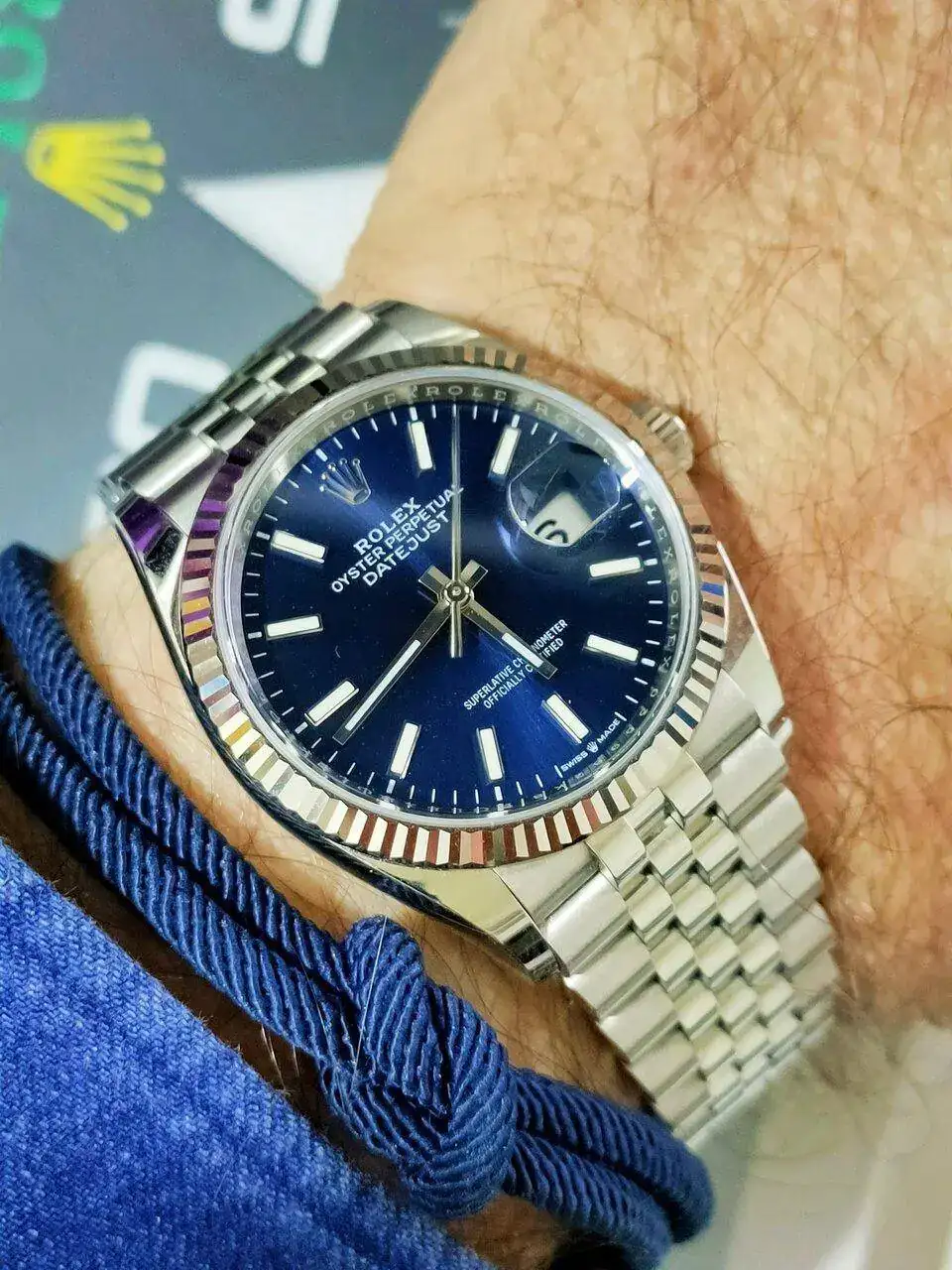 Nunca me canso de ver tu Datejust, con el dial azul es muy bonito. Para mi el DJ me gusta con bisel estriado y jubilee, con bisel liso y oyster esta el Oyster Perpetual. Es una pena que el Day Date azul lleve números romanos en vez de indices, como me gusta solo está en negro, pero da igual porque no me lo voy a comprar que ese si que pica el bolsillo.