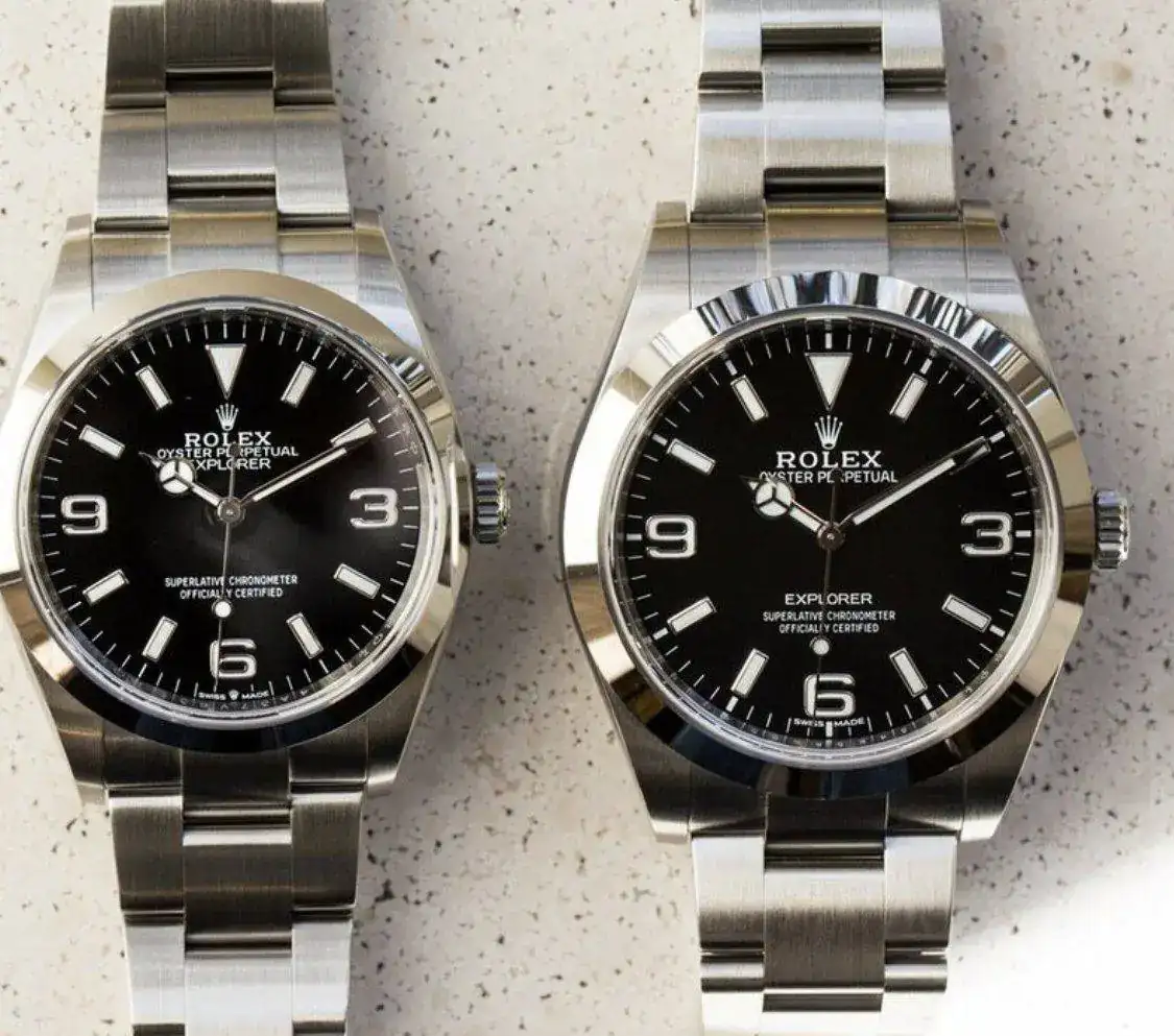Se diferencian las dos medidas a simple vista porque la serigrafía de Explorer en el de 36 está ubicada en la parte superior y en el de 39 en la inferior.Es el explorer de 36 o 39mm? ( Beca)