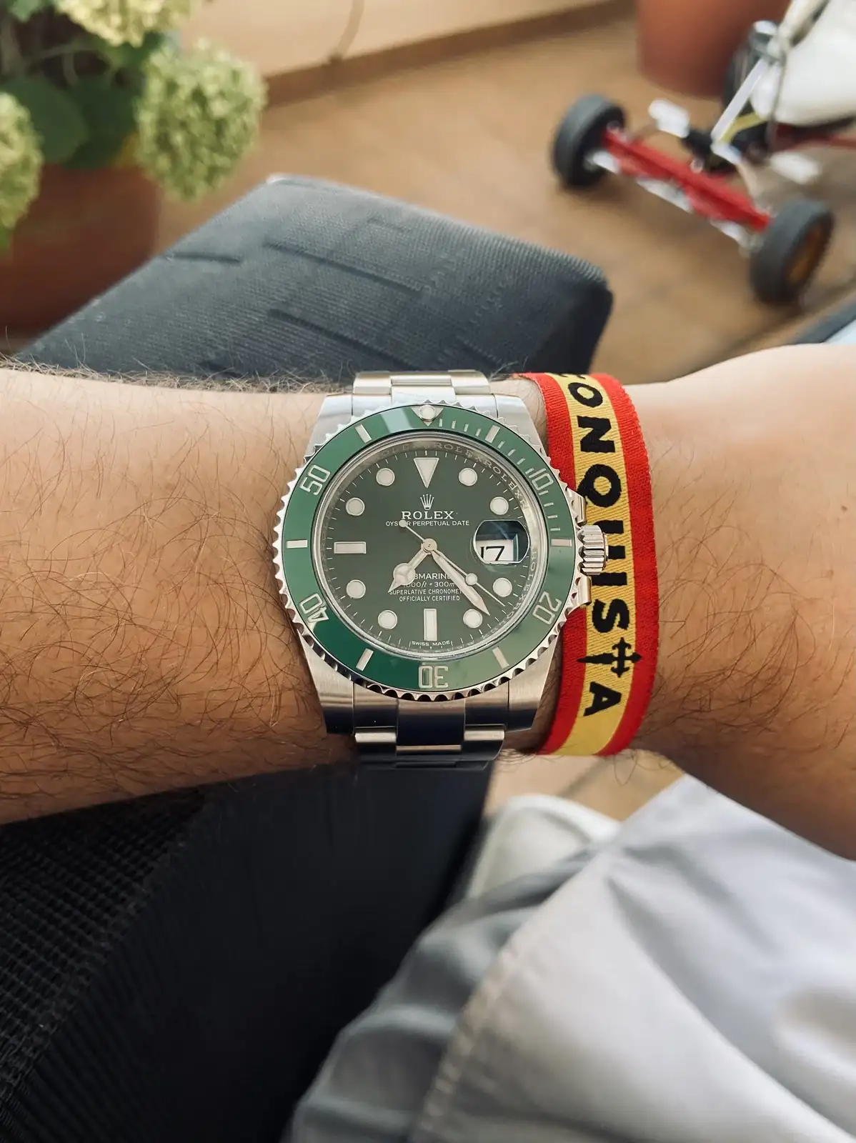 Jejeje ninguno está mal! Gracias compañero! Raro es que yo lleve una pulsera y más raro que la lleve en la muñeca del reloj…Buenos días no se si me gusta más el reloj o la bandera ! Saludos