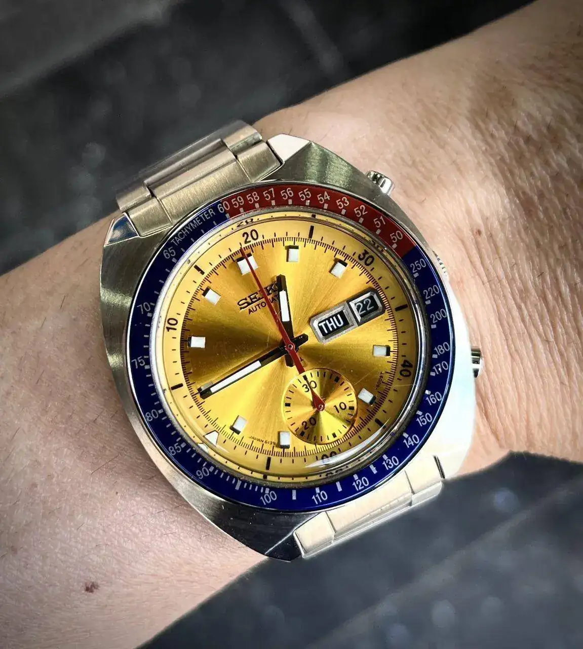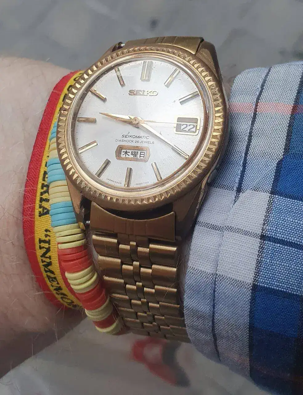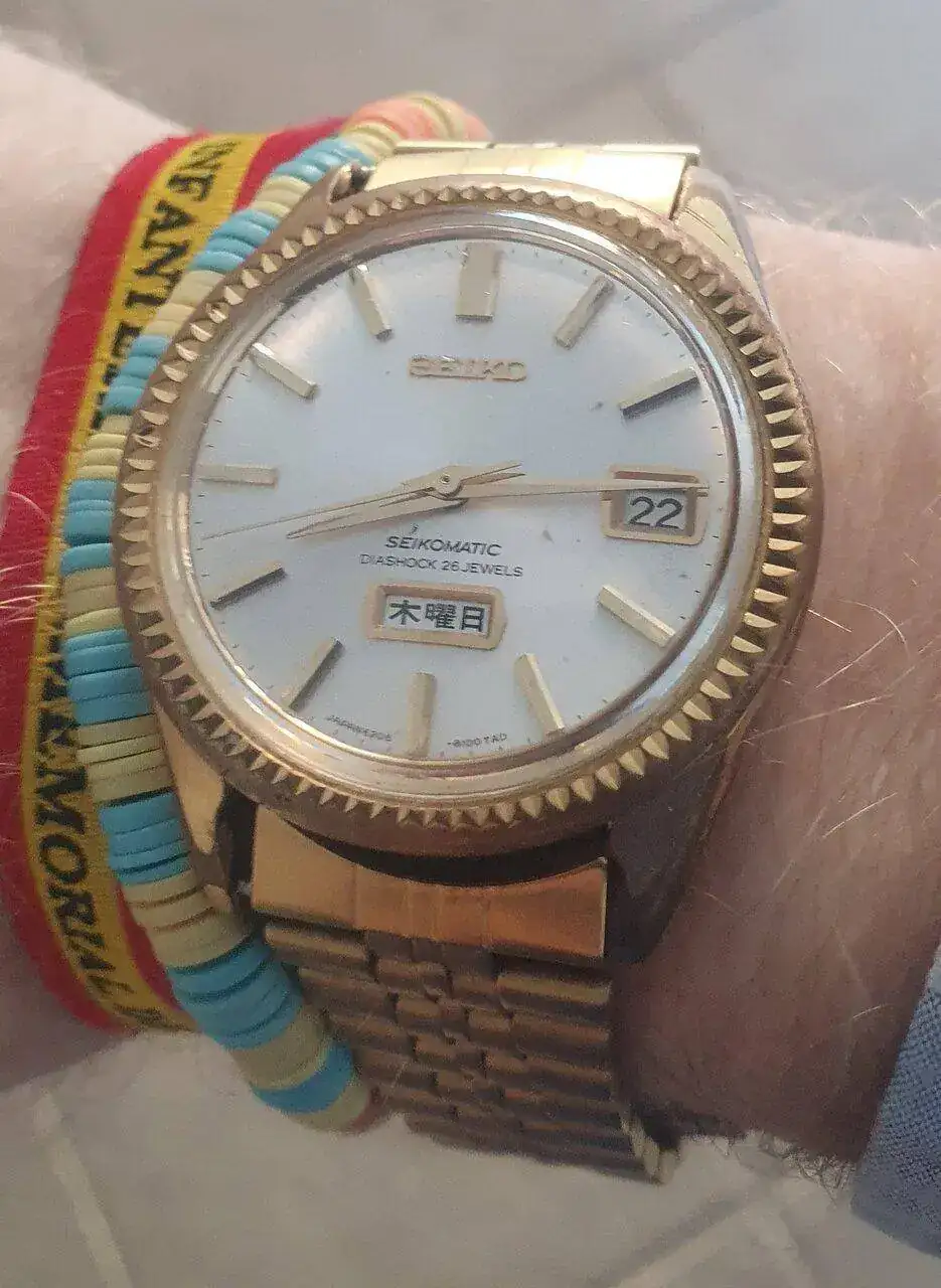 Qué bonito es. Creo que debe ser anterior a 1968, ¿fue por ese año cuando estos Seikomatic con día y fecha empezaron a llamarse Seiko Business más o menos, no? Es un Seiko de una época con esa mezcla entre antiguo y moderno que me encanta. Por un lado tiene ese aire añejo de los japoneses de los años 60 con su bisel estriado un poco gastado, su ventanilla a las seis con el día completo, las agujas dauphine, pero que por otro lado tiene muchos rasgos ya modernos que hoy día son atemporales. Y el día completo en kanji le da un aire exótico muy chulo, es una versión muy atractiva este tuyo.Buenas noches!