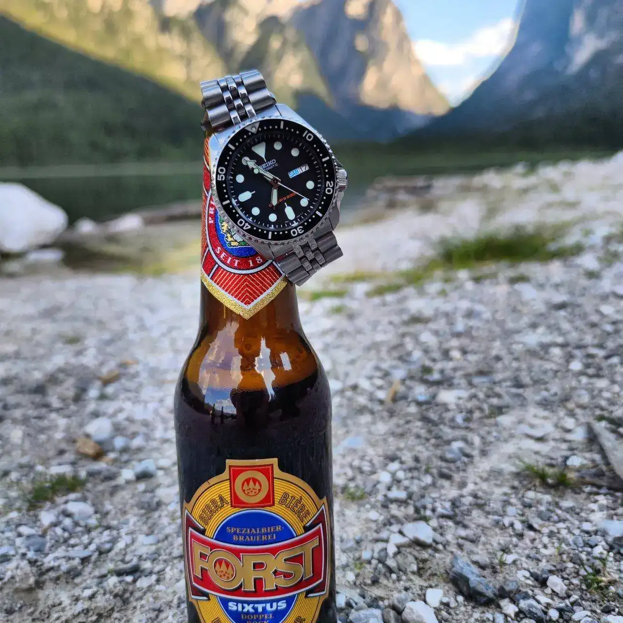 Hacia tiempo que no pasaba por aquí, foto de tres de mis pasiones: relojes, montaña y cerveza.