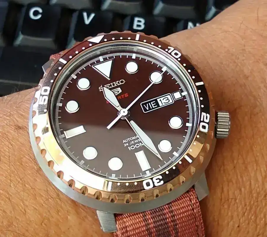 Precioso¡Recién comprado! Hay que decir que los detalles están mucho más cuidados que en el 007. Anillo interior y bisel perfectamente alineados, +4 segundos diarios (medido con cronocomparador), dial de un extraño negro-gris tornasolado que hace cosas preciosas que no se aprecian en la foto, y el maravilloso color tostado de los índices. Para resumir, que es una compra maestra y que estoy encantado. Los he podido ver casi todos y este es el que me ha convencido. Se echa de menos la corona a rosca, pero no creo que vaya a ser ningún problema.