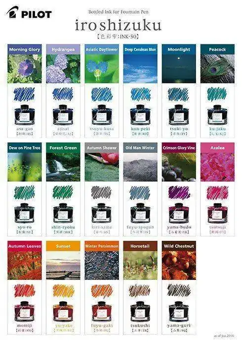 Yo tengo Yama-Budo y Tsukushi, y me gustan mucho. Además de por el color, por el tintero, y por lo fácil que parecen fluir y limpiarse. No sombrean mucho, pero se lo perdono. La gama de colores me encanta, y no compro más por su precio.