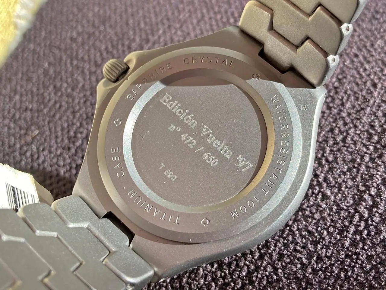 Pero un reloj totalmente de titanio, con la misma máquina que los primeros Aerospace de Breitling y encima NOS era una tentación demasiado grande para mí. Pertenece a una edición limitada de 650 ejemplares para la Vuelta 1997.
