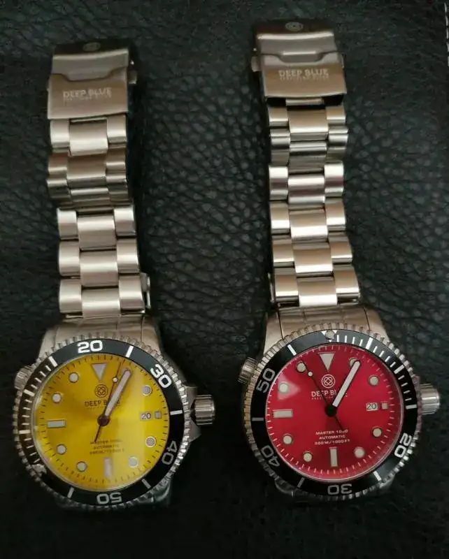 Tengo uno dial negro,bisel verde....En mi búsqueda de uno rojo como el tuyo, y otro amarillo, y como solo compro relojes nuevos (una manera como cualquier otra de refrenar mis compras...), empujado también por esa conocida ansia nuestra, me hice con estos dos Deep Blue Master 1000 (aunque el dial no es mate, sino brillo; y los biseles negros):