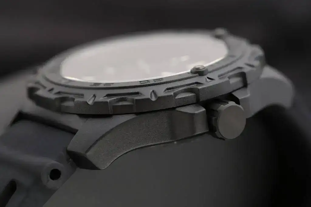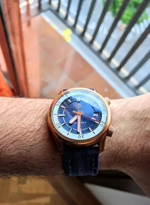 El Helmsman 2 lleva ambas coronas roscadas y lumeadas. Los laterales de la carrura "fresados" y cristal de zafiro abombado. Chulo chulo