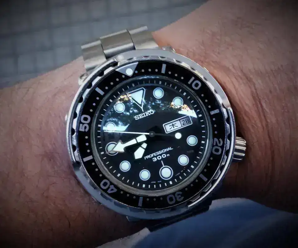 Pues hoy este, me lo regalaron roto, arañado y sucio, lo restauré a tope, le monte el dial "Scubapro" un bisel "Batman", unas manecillas "plongeur" y un zafiro abombado "doublé dome" para devolverlo a la vida.