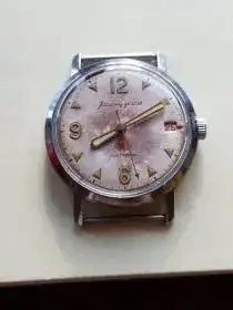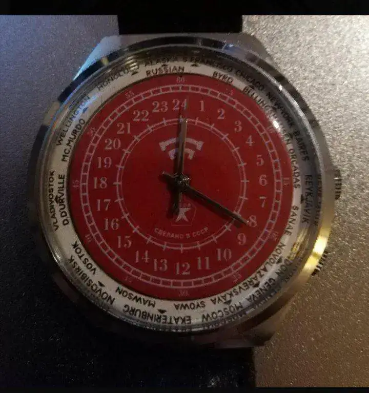 El reloj es bonito aunque creo que la esfera interior roja no le corresponde al original, es decir es impresa con posterioridad. Suele pasar a menudo con los relojes raketa de 24 horas, yo tengo un reloj tambien precioso con la esfera reimpresa en los 90 del rompehielos Lenin. Siendo el original del 1.977.