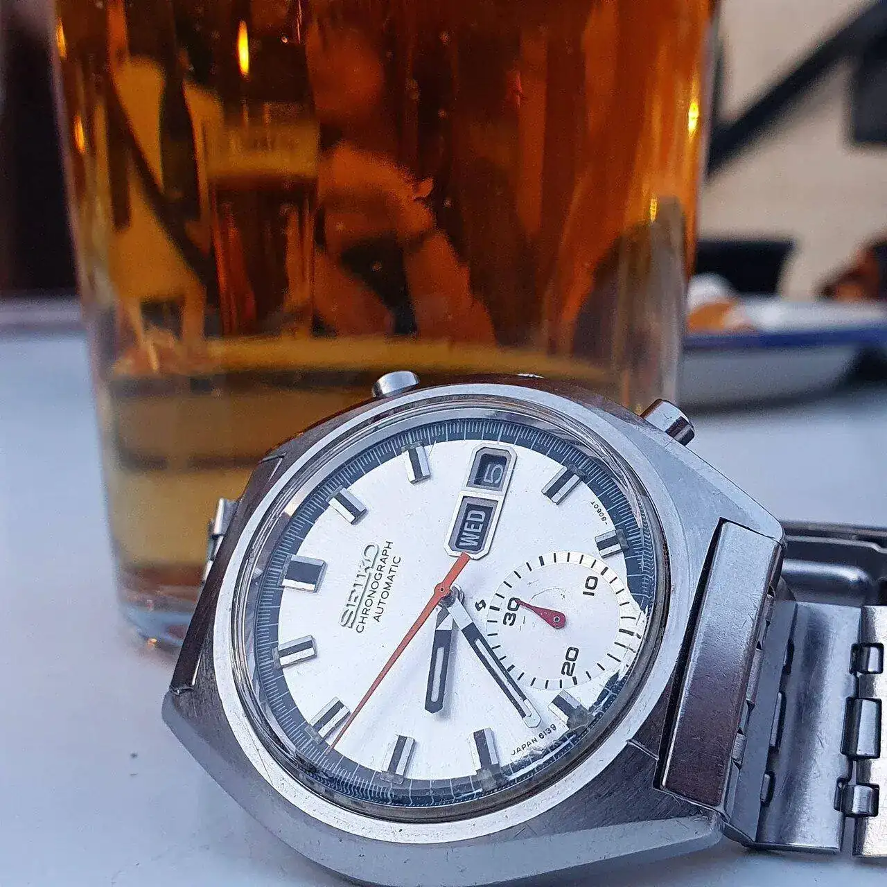 Seiko 6139. Su contadora de minutos viene de un Pogue y aunque tiene fácil solución, yo no quiero cambiarla. Requería mantenimiento. Su brazalete es original.