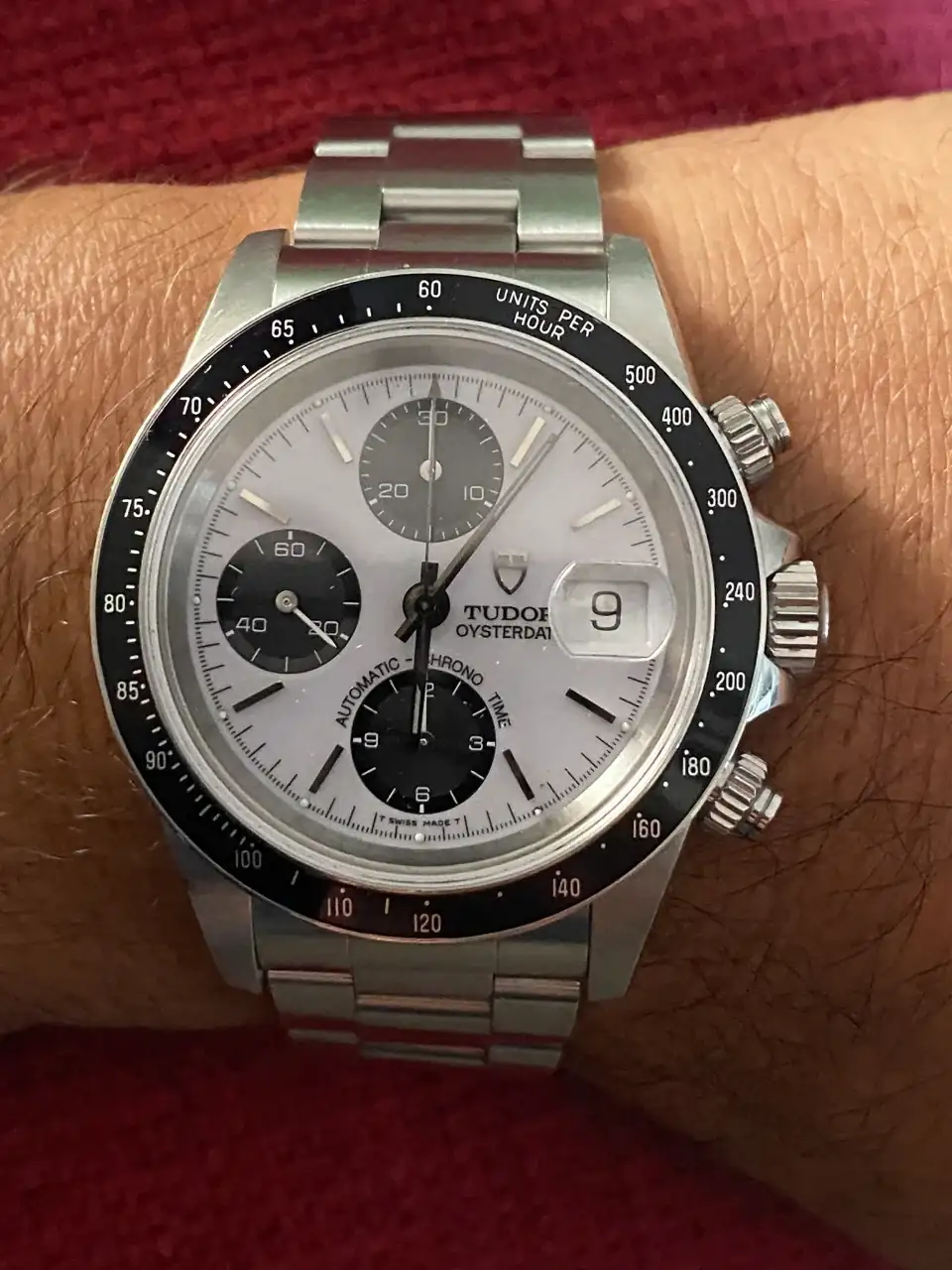 Tudor describe este dial blanco en particular como un dial de estilo esmalte. Algunos coleccionistas también lo llaman dial de porcelana, ya que tiene las mismas características que el dial de porcelana del Rolex Daytona (que es aproximadamente 20 veces más valioso), y déjame decirte que este Tudor es igualmente impresionante. Ese brillante y reluciente dial blanco de estilo esmalte presenta subesferas ‘Panda’ con un hermoso acabado circular Guilloché, cuyo tono cambia ligeramente dependiendo del ángulo de visión, pasando del negro a un tono casi antracita, aportando una gran profundidad al dial. ¡Realmente impresionante!