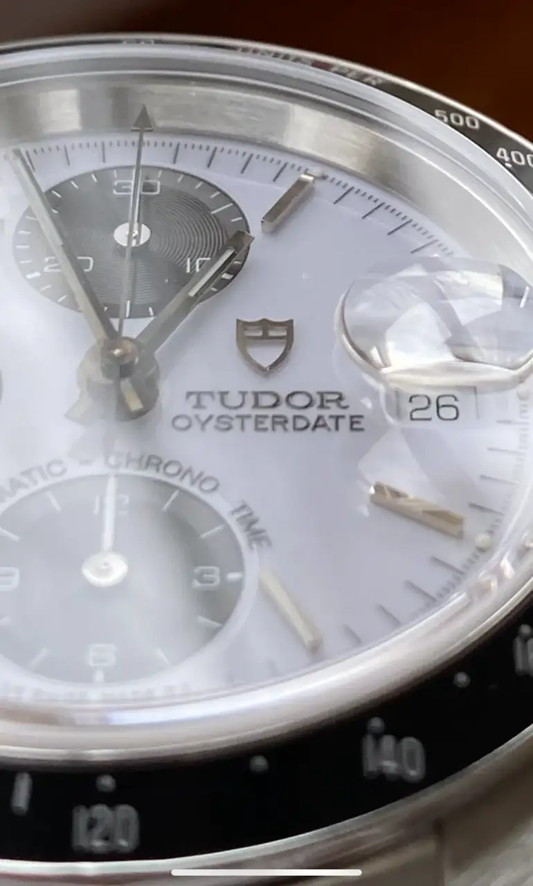 Este cronógrafo Tudor es bastante único. La referencia 79260 se introdujo en 1995 con el nombre de Prince Date, y más tarde se asoció con Tiger Woods. Sin embargo, si miras debajo de la fecha en este Tudor, verás impreso ‘Oysterdate’ en una fuente serif muy delgada, algo que solo se encuentra en los modelos de 1995. Pero no solo es la tipografía lo que lo hace especial, sino toda la forma en que se imprimió este dial.