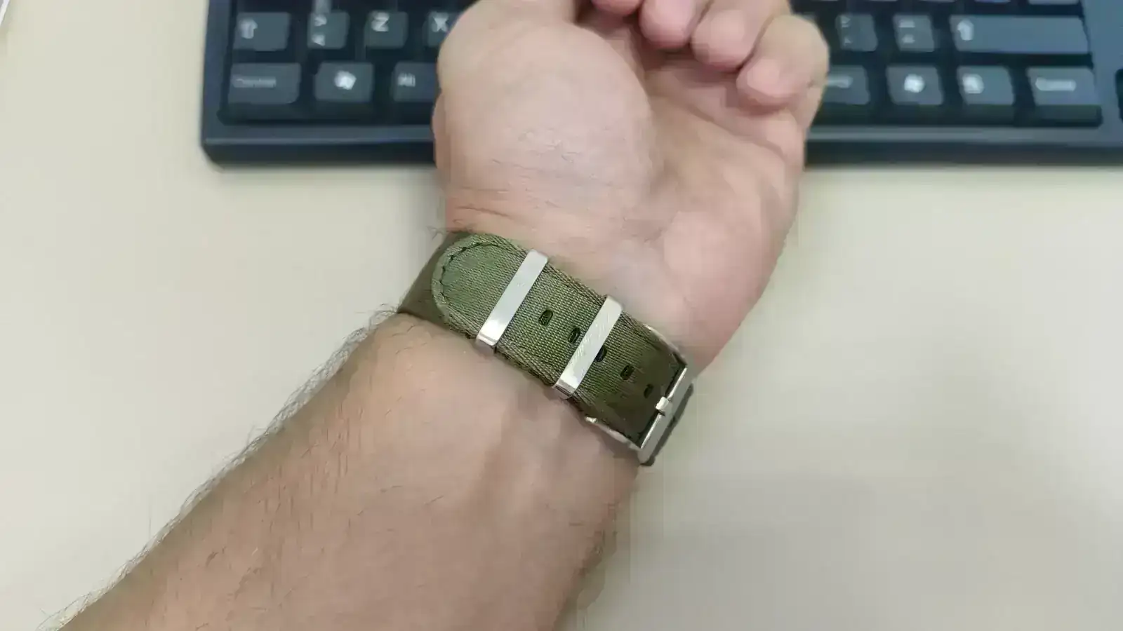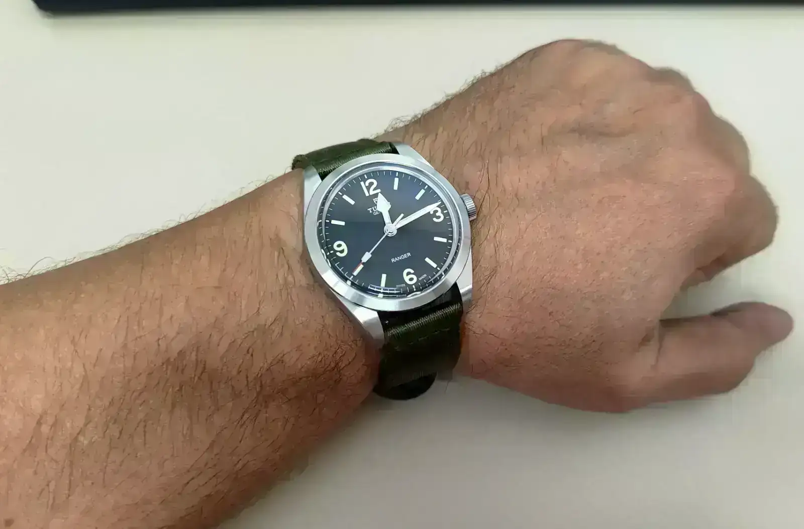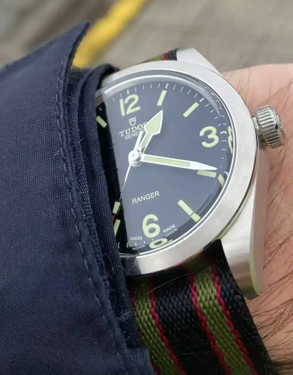 Es curioso, que normalmente no soporto las correas más de dos días, ya que me resultan incómodas, pero por curiosidad y casualidad, me dió por cambiar las partes de la correa de sitio, y se produjo el milagro. He puesto la parte más larga a las "12" y la de la hebilla a las "6", y de esa forma, el cierre cae en otra parte, y ha sido mano de santo. Ahora mismo me resulta comodísimo así, y encima mucho más ligero que con el brazalete. Y además, le da un rollazo táctico al Ranger que me encanta 😍 Ya habrá tiempo de ajustar el brazalete y usarlo con él, pero de momento ya no tengo prisa. Y para rematar, al ser la correa de nylon se puede mojar.
